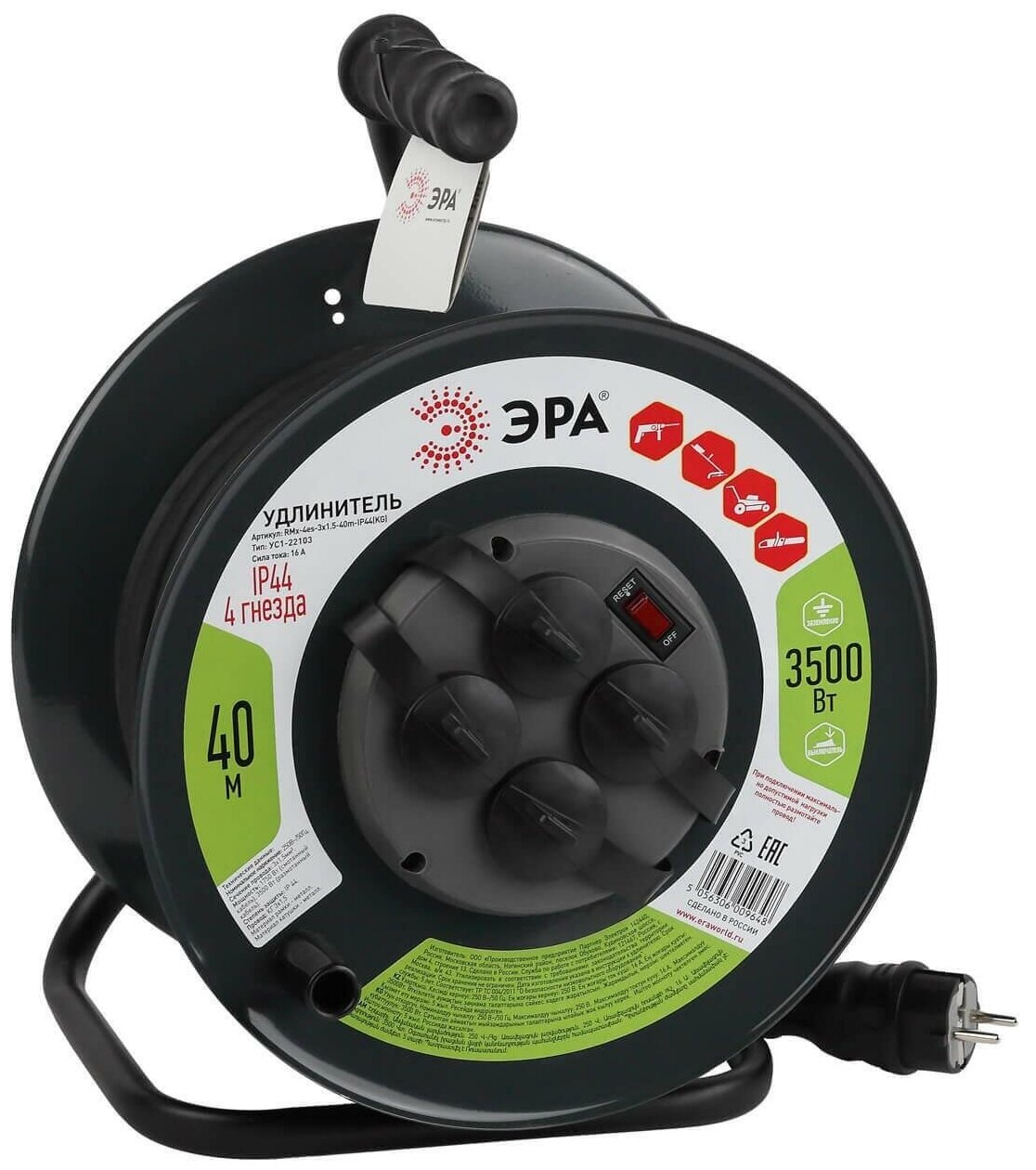 Удлинитель силовой Эра RMx-4es-3x1.5-40m-IP44(KG) (Б0046848) 3x1.5кв.мм 4розет. 40м ПВС 16A метал.катушка черный