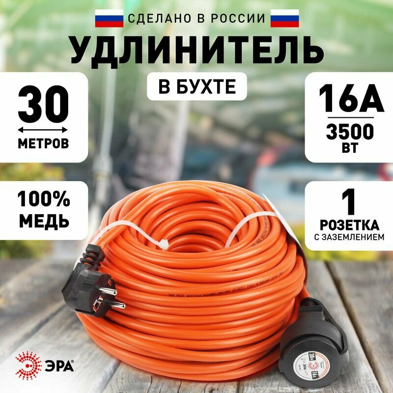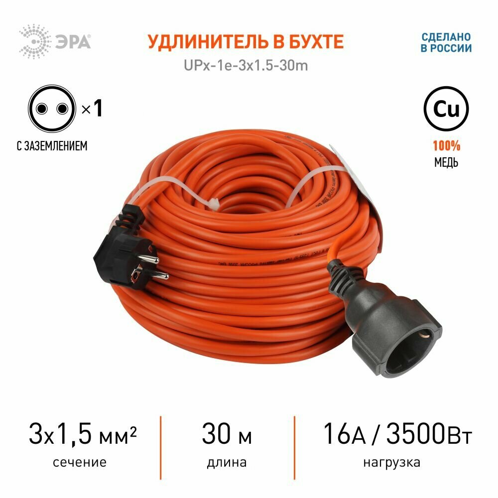 Удлинитель силовой в бухте ЭРА UPx-1e-3x1.5-30m-IP44 с заземлением, ПВС 3х1,5м2, 1 розетка, 30м, степень защиты IP44. Мощность 16А/3500Вт. Используется для работы на строительных площадках или дачных участках. Удобен при работе с приборами находящимися удаленно от стационарной розетки,. Например, газонокосилки, электрические, пилы, триммеры или электродрели. Провод в удлинителях Эра сделан из 100% меди, что делает его абсолютно пожаробезопасным.