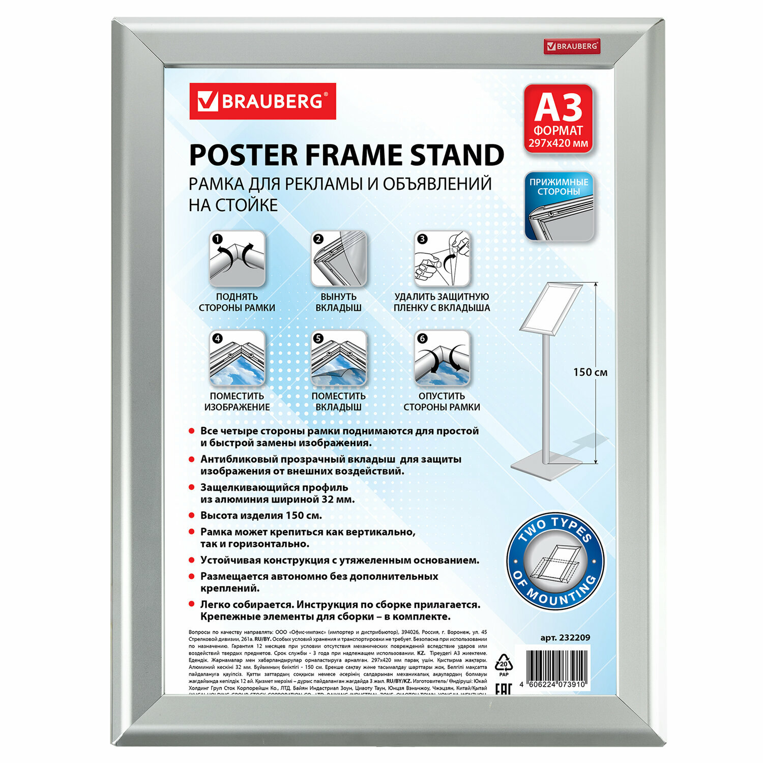 На сегодняшний день товар «Рамка для рекламы и объявлений BRAUBERG 42x594 см Рамка настенная для рекламы 420х594 мм» можно купить с кешбеком в 1 магазине: 21vek BY
