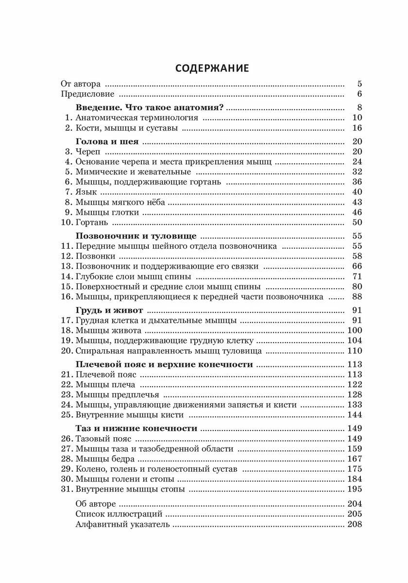 Книга содержит иллюстрации, в подготовке которых использовалась трехмерная цифровая анатомическая модель человека, и состоит из 31 главы, каждая из которых посвящена определенной части тела. Мышцы, кости и суставы не просто называются. Их функции подробно описываются простым и понятным языком, но вместе с тем в строгом соответствии с принятой анатомической терминологией.