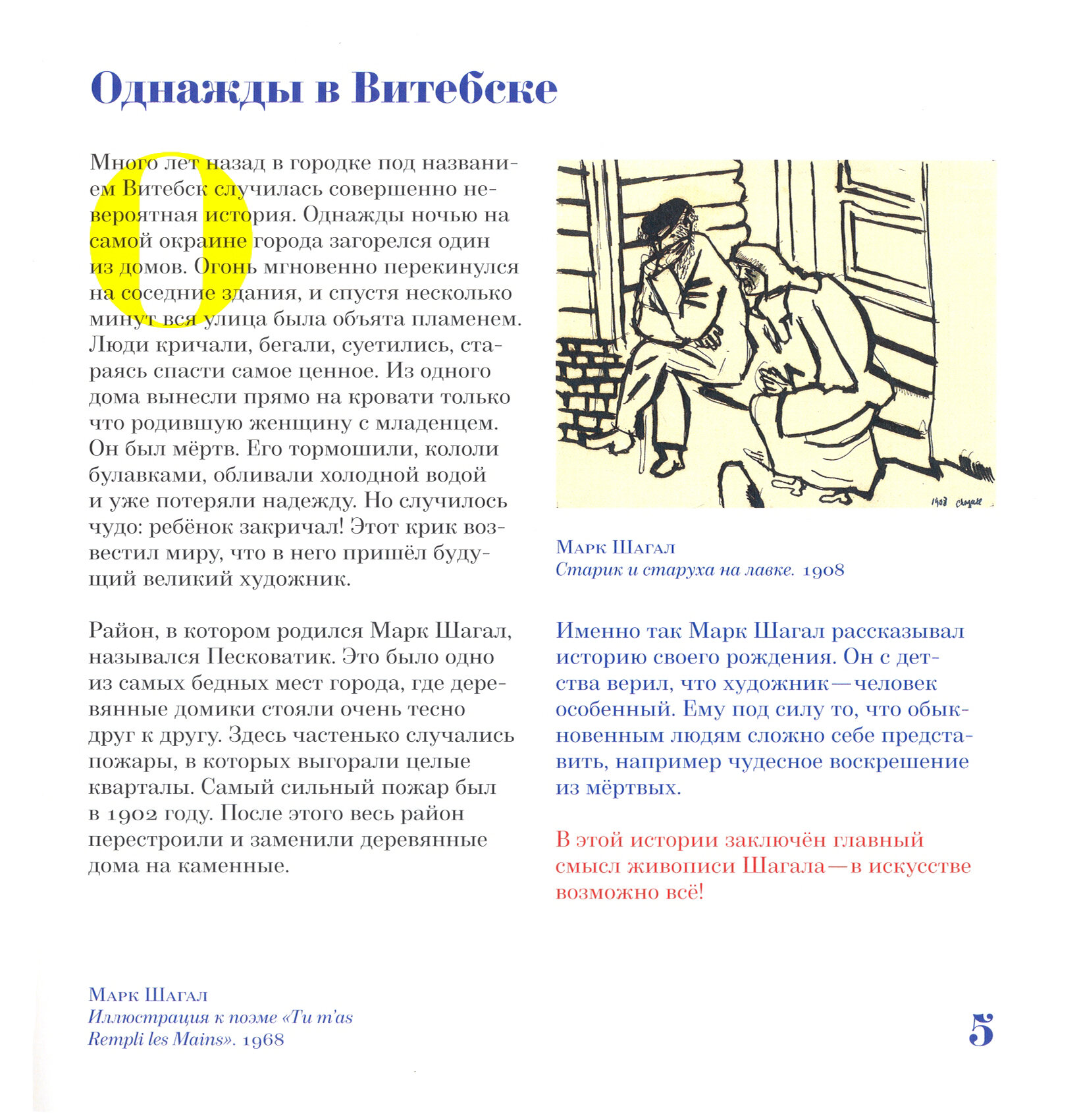 Эта книга познакомит детей с удивительным искусством Марка Шагала, знаменитого во всём мире художника, чье детство и юность прошли в российском захолустье. Творчество Шагала всю жизнь питали впечатления родного Витебска, превращённого его кистью в озорную волшебную сказку. Ну а богемный Париж начала ХХ века, ставший второй родиной художника, помог ему найти собственный путь в живописи.