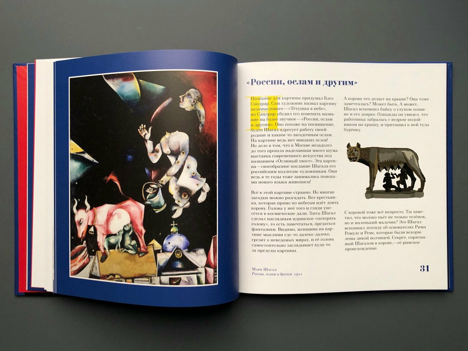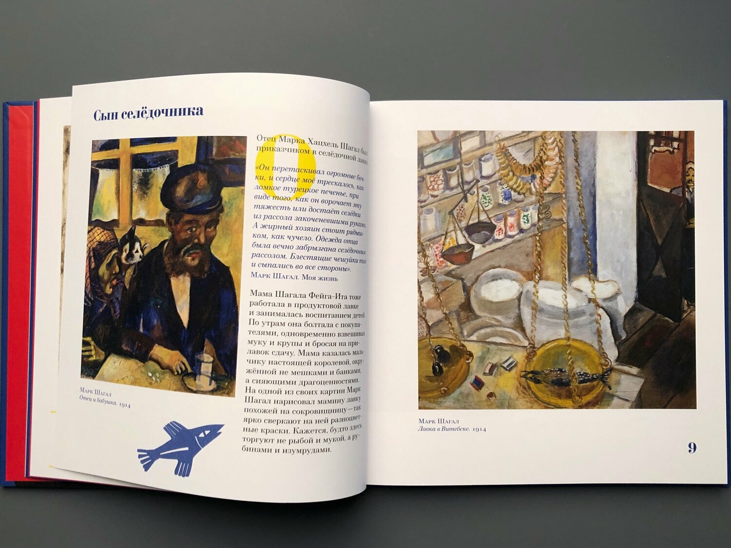 Книга проиллюстрирована репродукциями картин и рисунков Марка Шагала, она рассказывает также об исторических событиях, повлиявших на его жизнь и судьбы воспетых им людей – как его близких, так и прославленных современников.