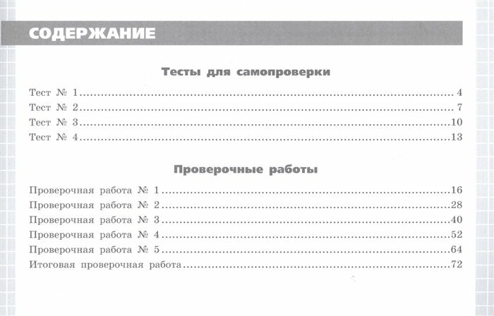 Пособие состоит из двух частей. Первая часть содержит тесты для самопроверки учащимися своих достижений и готовности к проверочной работе. Вторая часть содержит разноуровневые проверочные работы в четырёх вариантах по главам учебника и итоговую работу, также в четырёх вариантах.