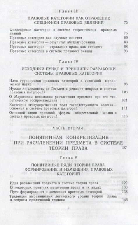 В книге значительное место уделяется анализу методологических посылок изучения правовых категорий; главной из этих посылок является марксистско-ленинская диалектическая логика. В ней рассматриваются также основные категориальные зависимости и логические связи правовых категорий, устанавливаются общие контуры понятийной системы теории права.