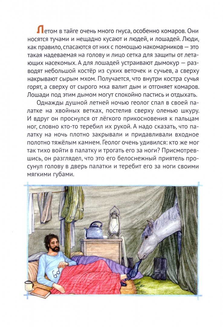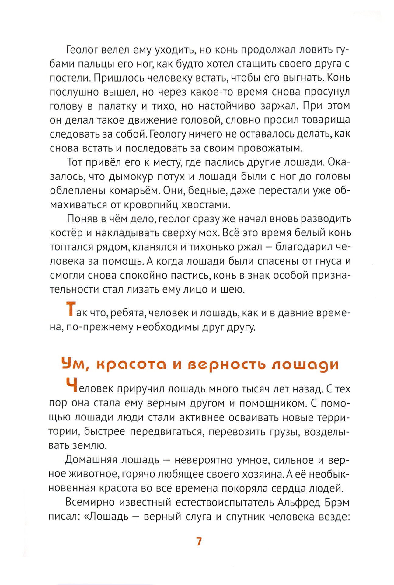 Хорошую тему подняла автор-составитель этой книги. Дети должны понимать, что животные это не просто часть нашего мира, они необходимы человеку даже больше, чем мы им. В книге добрые, познавательные рассказы. Также в книгу включён отрывок из рассказа Куприна А. "Ю-ю" про кошачьего "доктора". Показалось странным только то, что на иллюстрации к рассказу, в котором описан фрагмент, как в палатке спит геолог и его будит лошадь, почему-то нарисована тумбочка (стр. 6). В домике лесничего, в вагончике может быть тумбочка, но в палатке??? Хотя в целом цветные иллюстрации понравились. Текст читать комфортно. Книга на скрепке, бумага глянцевая, белая.