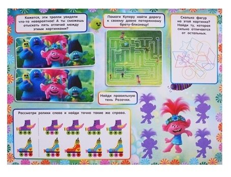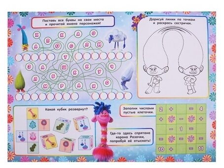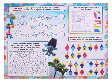 Очень занимательный альбом, яркие, качественные иллюстрации в стиле Тролли. Ребёнку очень понравился альбом, в нем много заданий, есть также страницы для собственного творчества. Формат большой, задняя обложка сделана из очень плотного картона, за счёт чего альбом не гнется. Вообщем, ребёнок доволен!