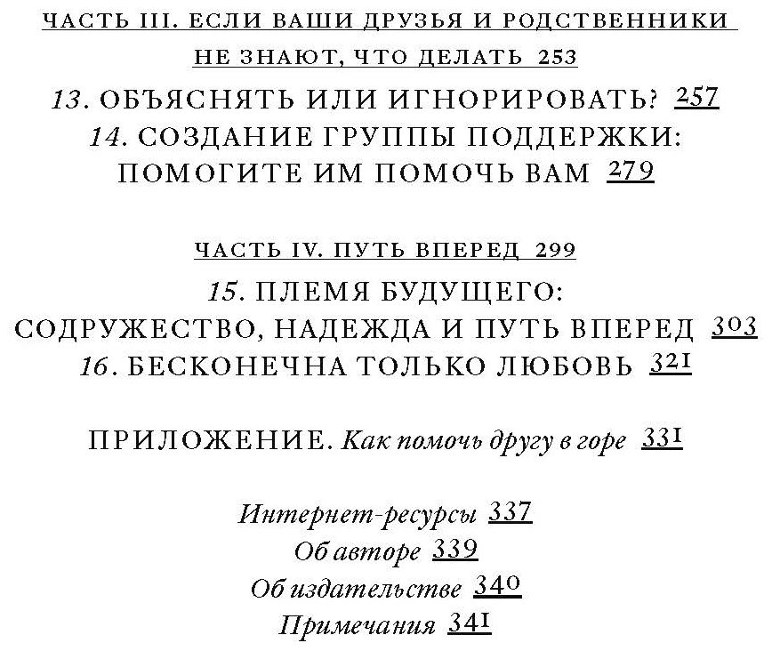 В книге излагаются взгляды на смерть близкого не как на проблему или болезненное состояние, от которых надо поскорее избавиться и вернуться к "нормальной" жизни, а как на процесс работы с горем. Такая проекция в корне меняет наше стремление помочь тому, кто горюет; она побуждает нас строить жизнь рядом с трагедией, а не пытаться уйти от нее.