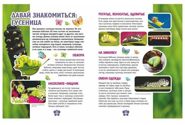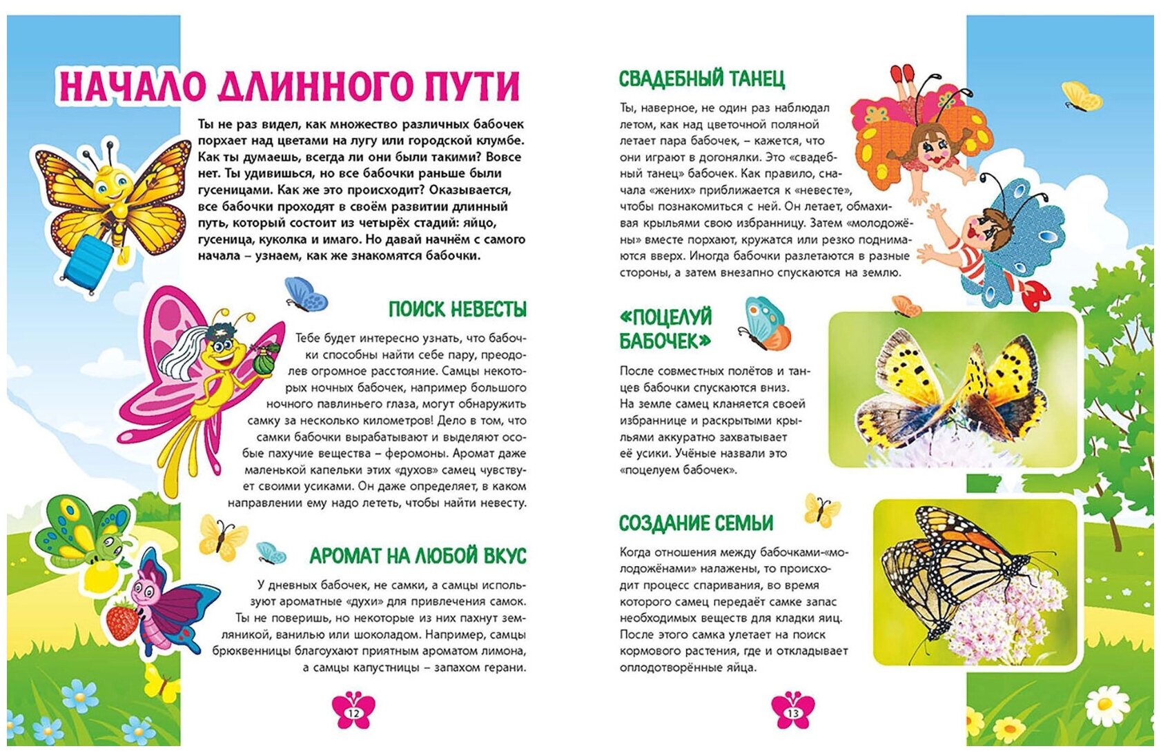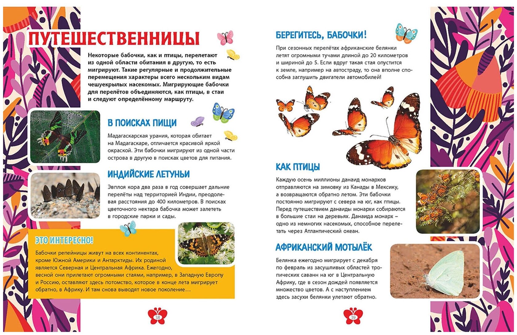 Из этой красочной энциклопедии ты узнаешь, какие легенды слагали об этих экзотических насекомых, где они обитают, какие у них враги, что такое имаго и метаморфоз, познакомишься с яркими дневными и неприметными ночными мотыльками, а также с самыми большими и красивыми бабочками в мире.
