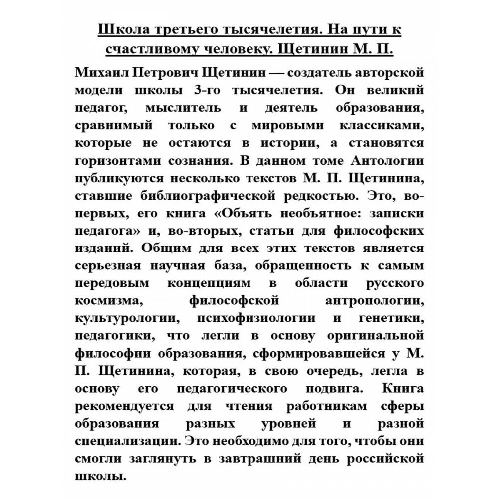 Михаил Петрович Щетинин - создатель авторской модели школы 3-го тысячелетия. Он великий педагог, мыслитель и деятель образования, сравнимый только с мировыми классиками, которые не остаются в истории, а становятся горизонтами сознания. В данном томе Антологии публикуются несколько текстов М.П. Щетинина, ставшие библиографической редкостью. Это, во-первых, его книга "Объять необъятное: записки педагога" и, во-вторых, статьи для философских изданий. Общим для всех этих текстов является серьезная научная база, обращенность к самым передовым концепциям в области русского космизма, философской антропологии, культурологии, психофизиологии и генетики, педагогики, что легли в основу оригинальной философии образования, сформировавшейся у М.П. Щетинина, которая, в свою очередь, легла в основу его педагогического подвига.