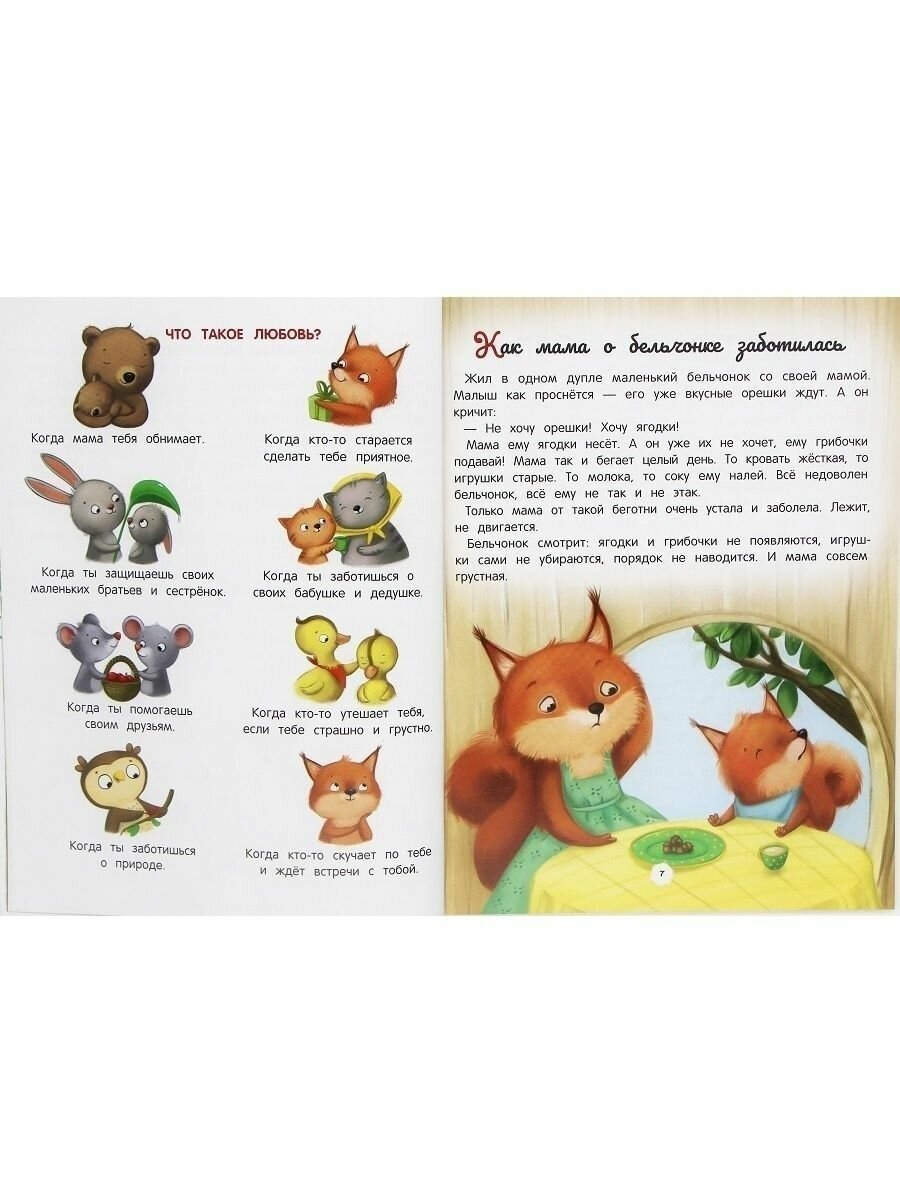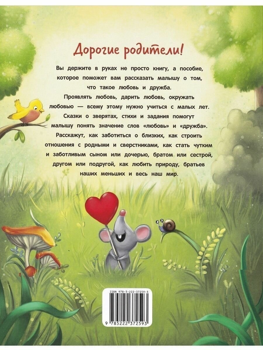 Сказки о зверятах, стихи и задания помогут малышу понять значение слова "любовь". Расскажут, как заботиться о близких, как строить отношения с родными и сверстниками, как стать чутким и заботливым сыном или дочерью, братом или сестрой, другом или подругой, как любить природу, братьев наших меньших и весь наш мир.