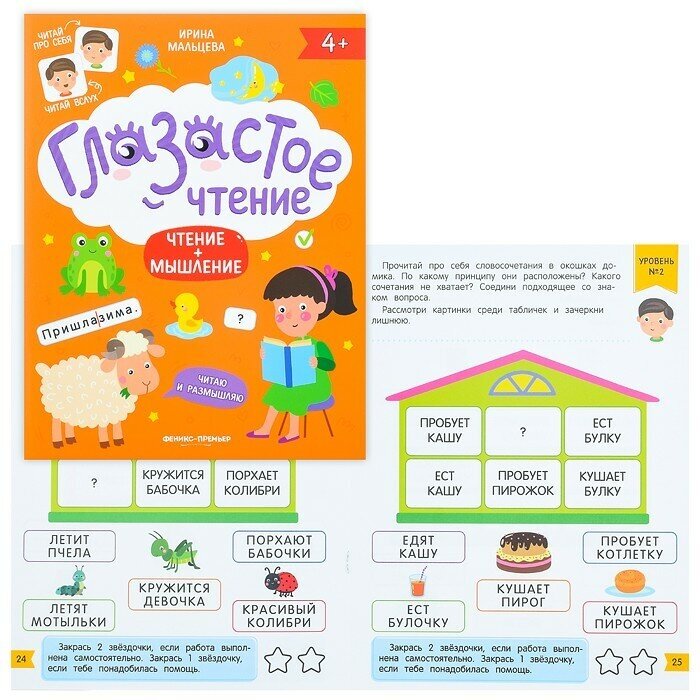 «ГЛАЗАСТОЕ ЧТЕНИЕ» — это серия из четырех тетрадей для супертренировки читательской самостоятельности ребенка на этапе освоения им чтения слов и предложений вслух и про себя.