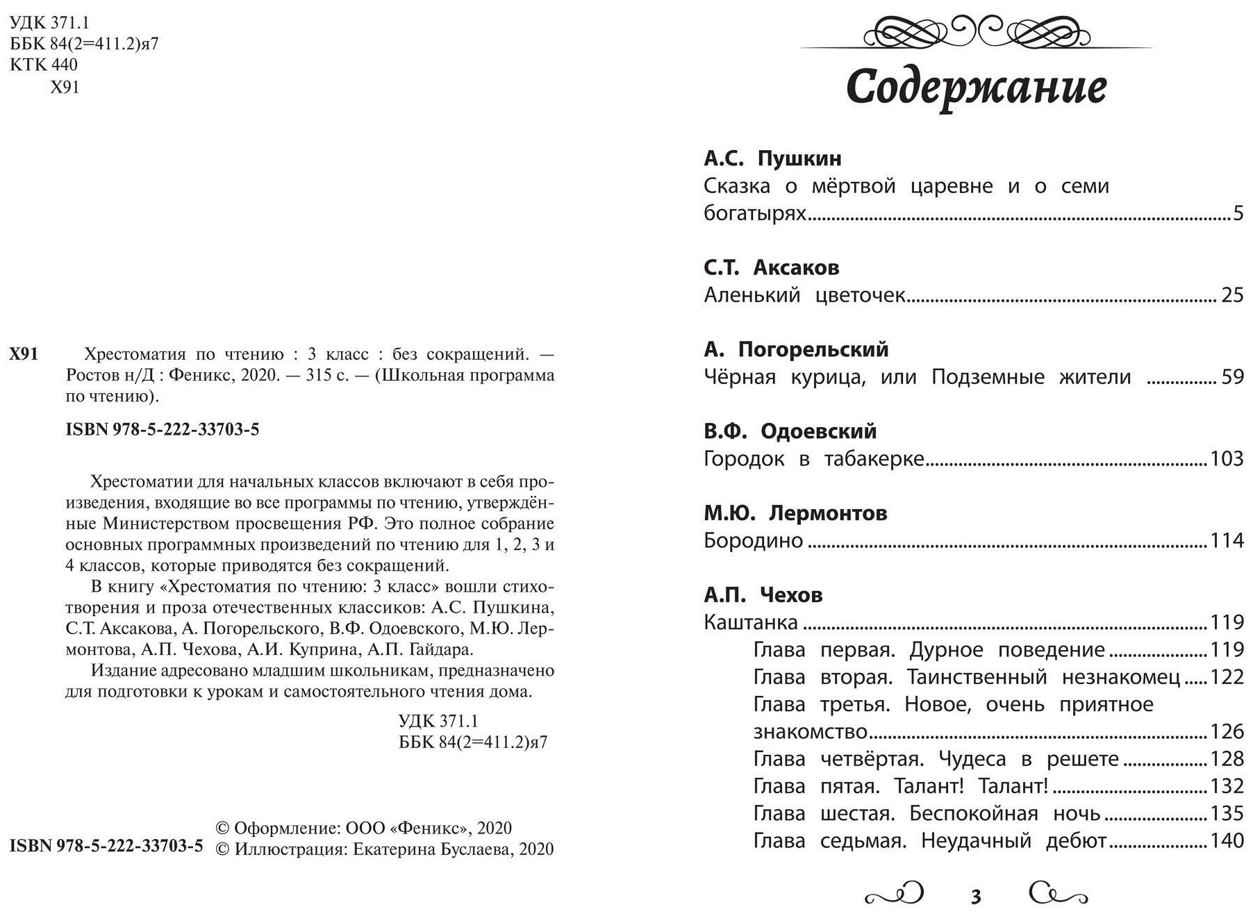 Хрестоматия по чтению. 3 класс. Без сокращений (Пушкин Александр Сергеевич, Одоевский Владимир Федорович, Лермонтов Михаил Юрьевич, Аксаков Сергей Тимофеевич); Феникс, 2022