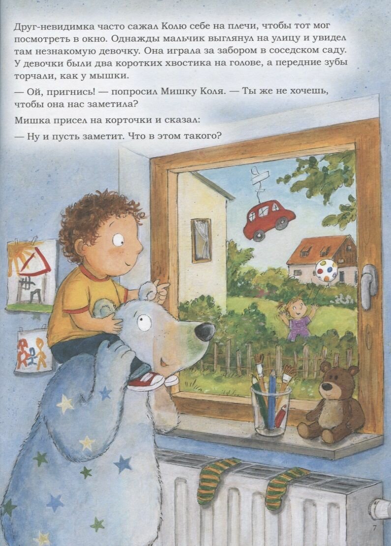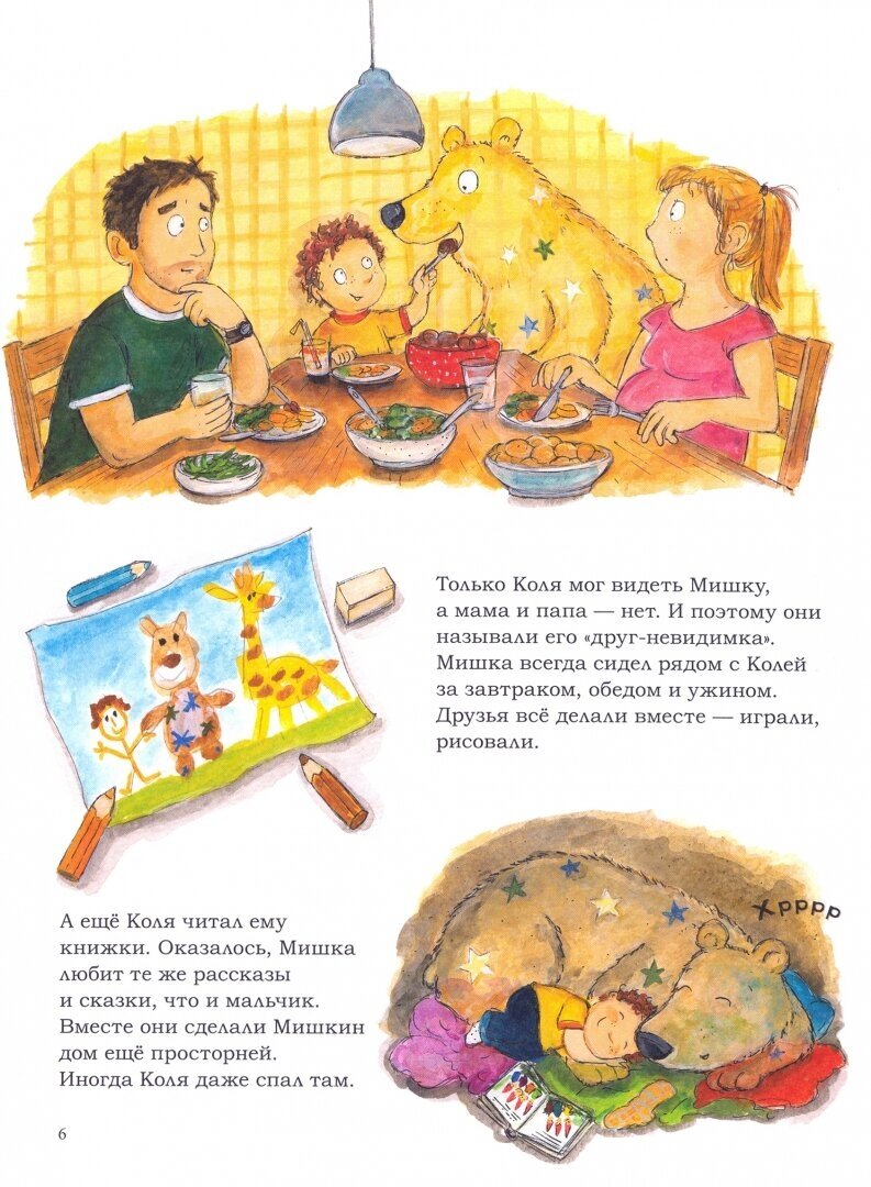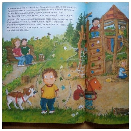 Так уж вышло, у младшего действительно был момент, когда у него бы свой друг невидимый. Нас с мужем это очень беспокоило, пошли к детскому психологу. И заодно я сейчас активно читаю книги по развитию эмоционального интеллекта детей, так вот в числе рекомендаций попалась и эта книга. Купила, принесла сначала нашему психологу - она книгу одобрила! Прочитали ее несколько раз с сыном, думаю, все вместе - и книга, и работа с психологом помогли ему пережить его состояние. В книге родители поддерживают малыша, это тоже очень важно. иллюстрации просто изумительные, сказочные