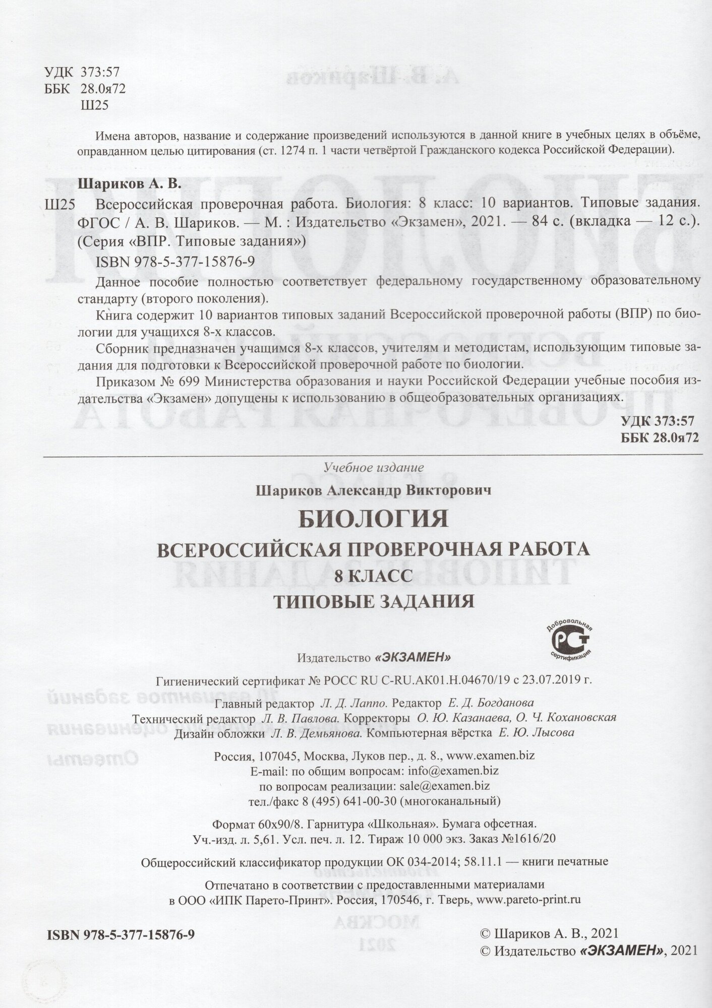 ВПР ЦПМ. Биология. 8 класс. Типовые задания. 10 вариантов. (Шариков Александр Викторович); Экзамен, 2021