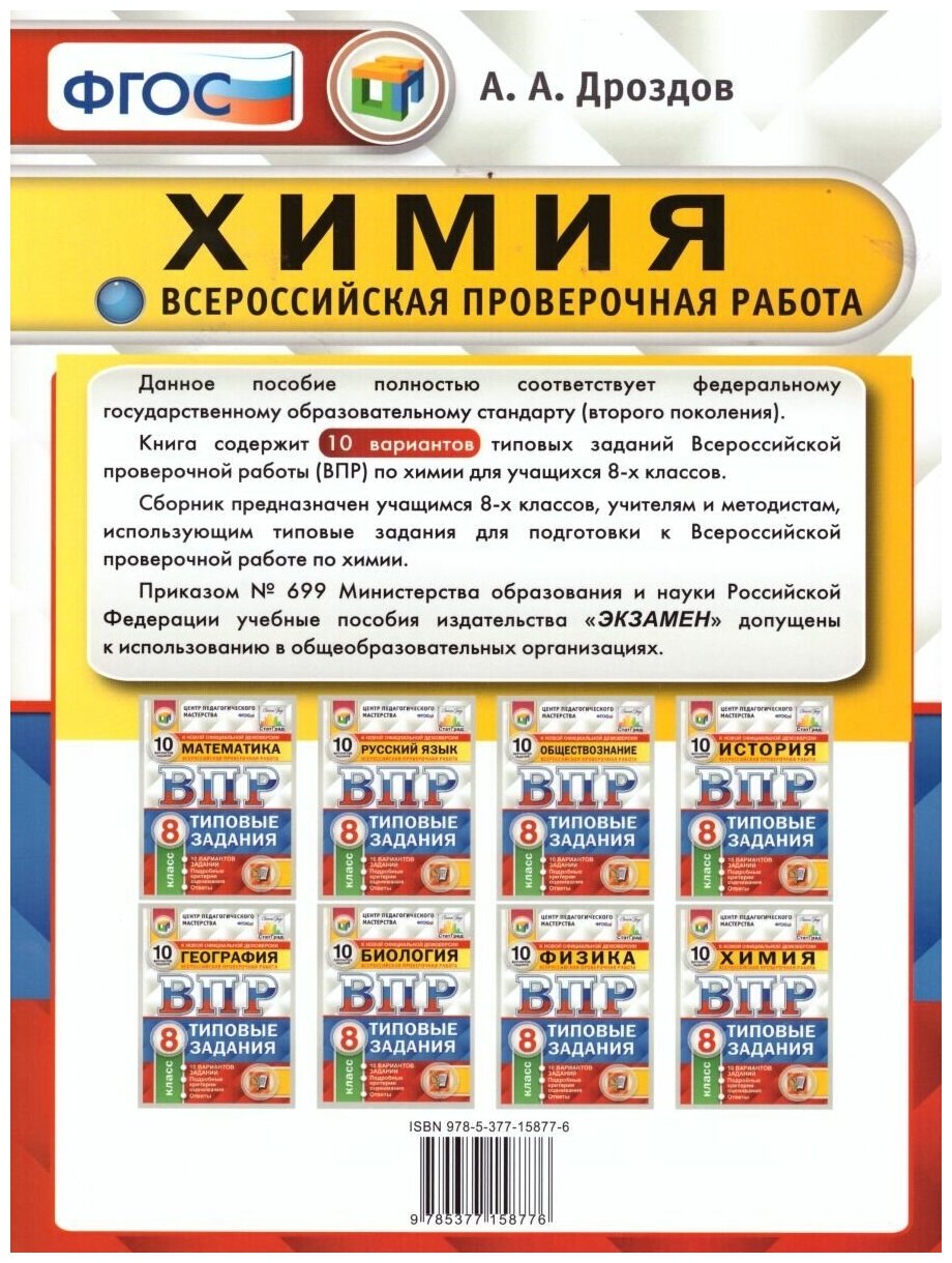 Сервис сравнения цен СкидкаГИД предлагает сравнить цены на товар «Книга: ВПР ЦПМ. Химия. 8 класс. Типовые задания. 10 вариантов. (Дроздов Андрей Анатольевич); Экзамен, 2021»