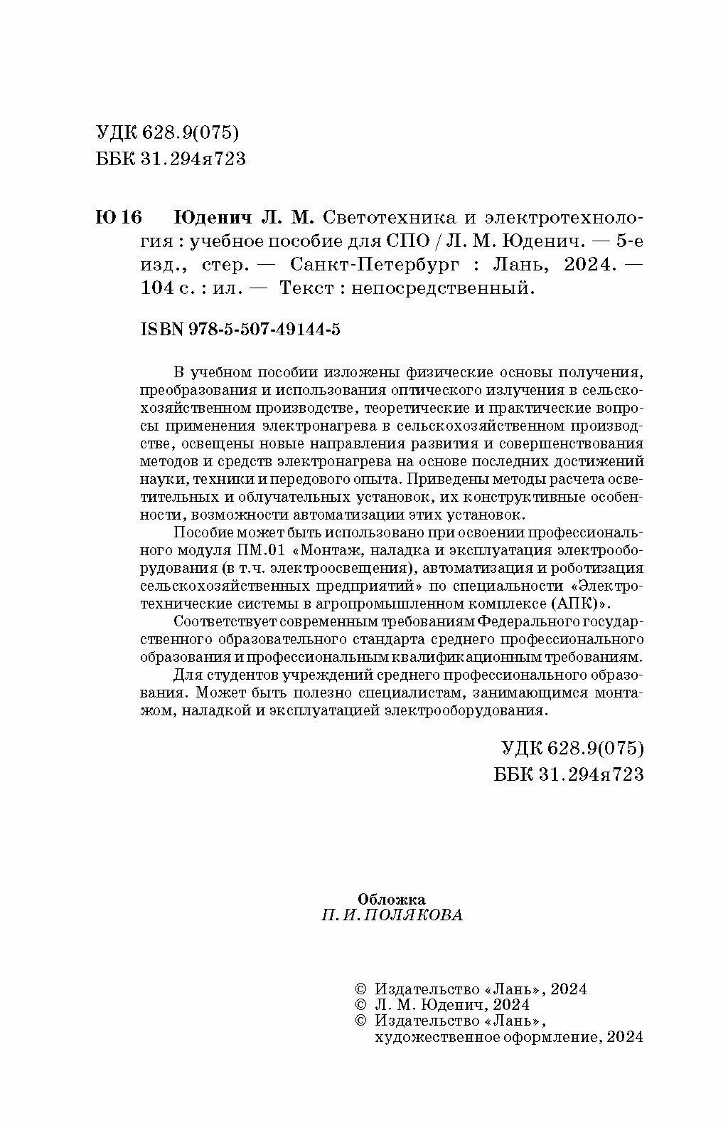 Светотехника и электротехнология. Учебное пособие (Юденич Лариса Михайловна); Лань, 2020