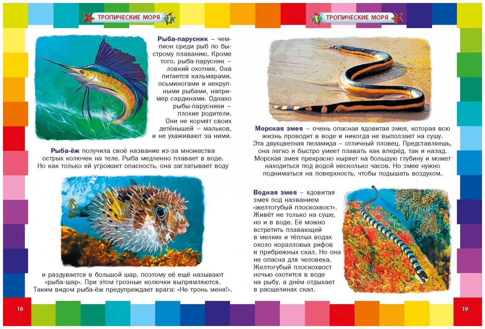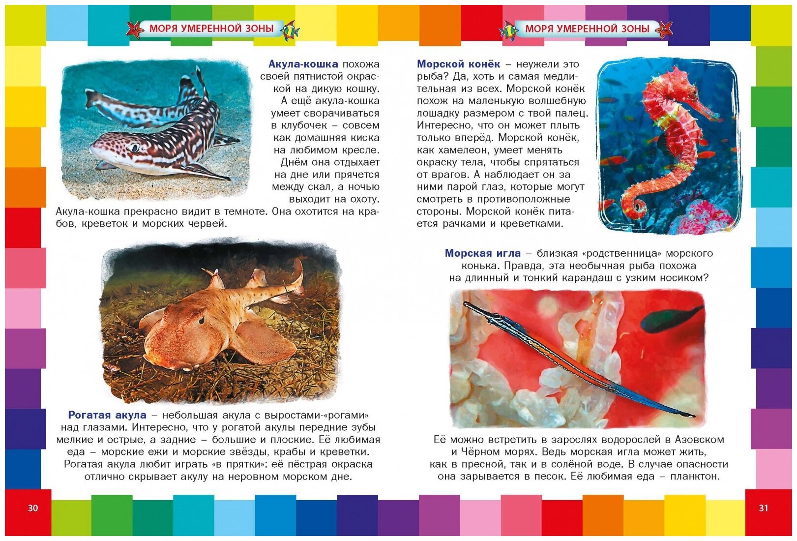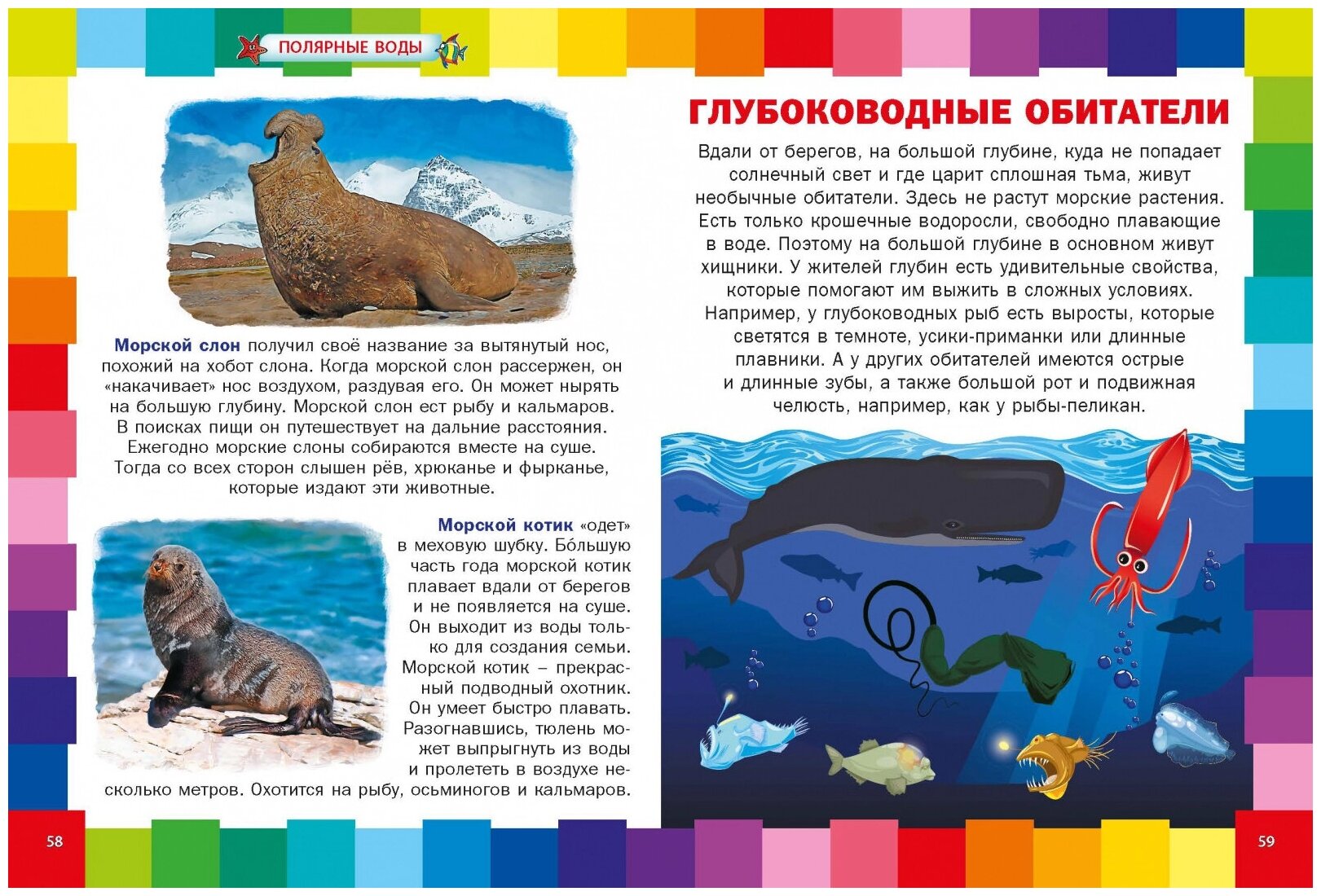 Перед вами книга о животных морей и океанов. Этих морских обитателей ваш ребёнок пока может увидеть только на картинках или в мультфильмах, поэтому уверены, что более подробное знакомство с ними в нашей красочной энциклопедии понравится и ему, и вам. Он узнает о животных, которые обитают в тропических и холодных морях, бороздят просторы океанов, прячутся на глубине морских вод, познакомится с огромным синим китом и крошечной креветкой, необычными рыбами и симпатичными тюленями!