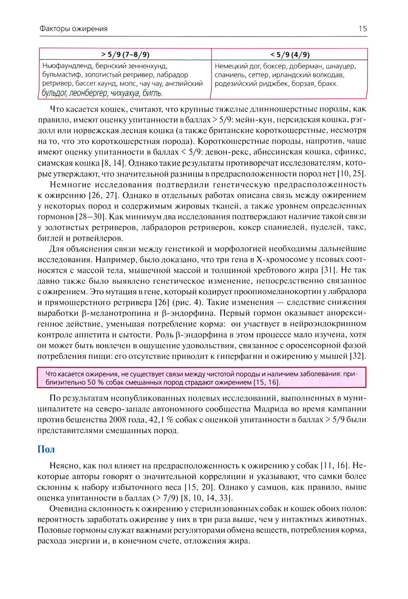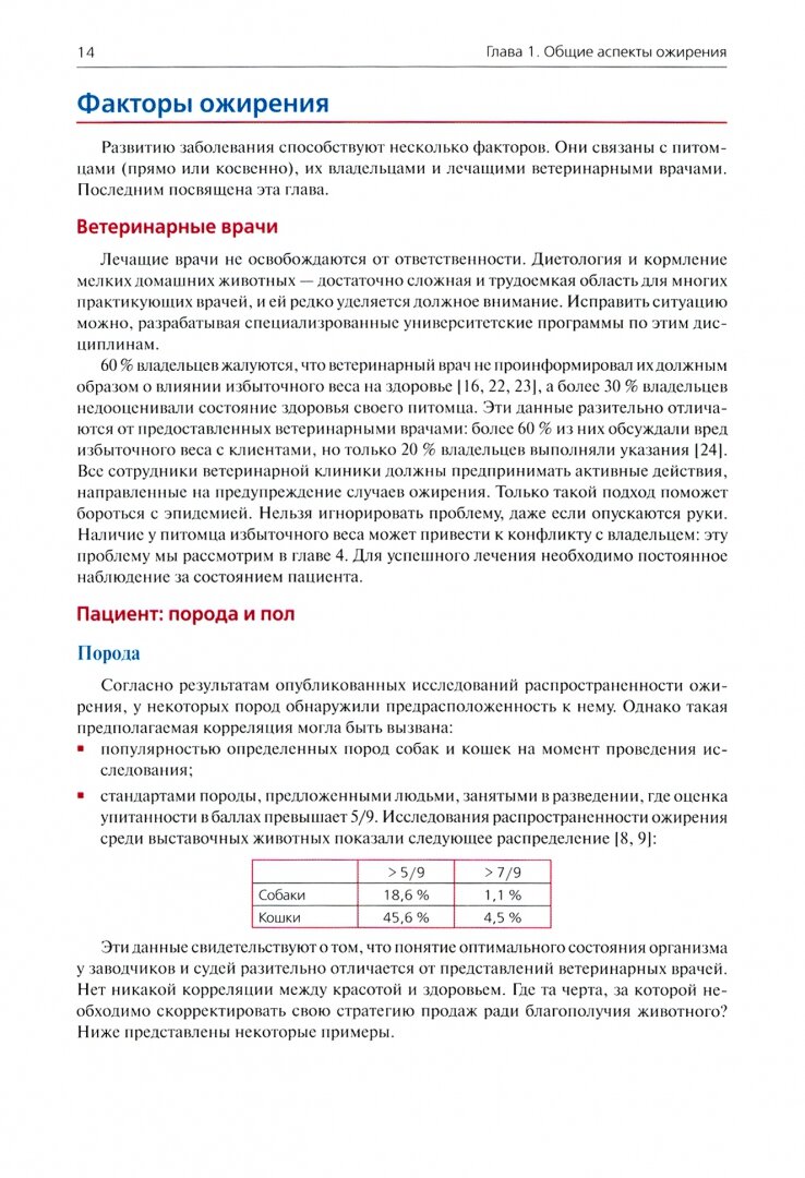 Первая часть книги описывает синтез жиров, влияние на процесс эндокринных факторов и генетики. Далее автор фокусируется на терапии, возможном лечении с использованием диет, с особым вниманием описывает пищевые потребности, возможность медикаментозной терапии и оперативного вмешательства. Много внимания уделено такому важнейшему фактору лечения ожирения у питомцев как донесение до владельца всей серьезности данного заболевания и привлечение его к участию реализации эффективной программы контроля и профилактики ожирения.