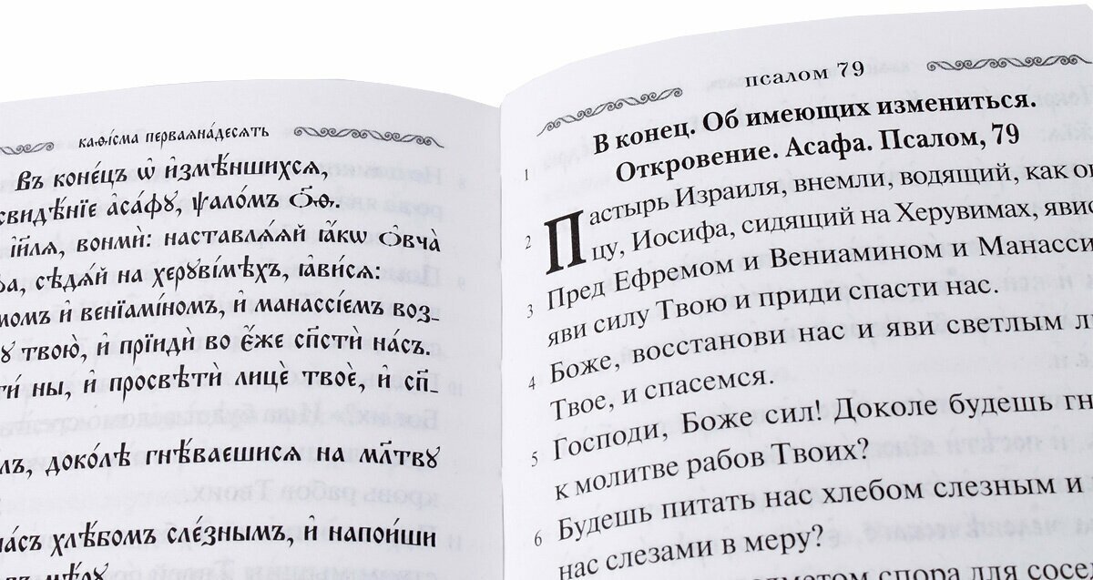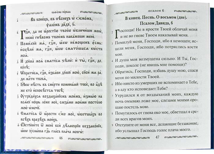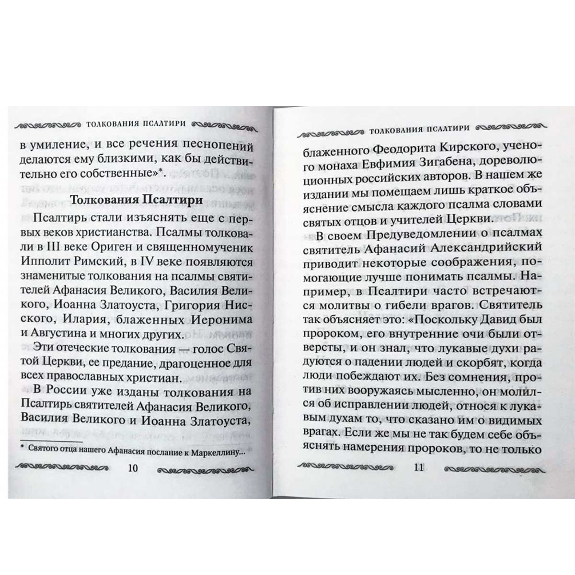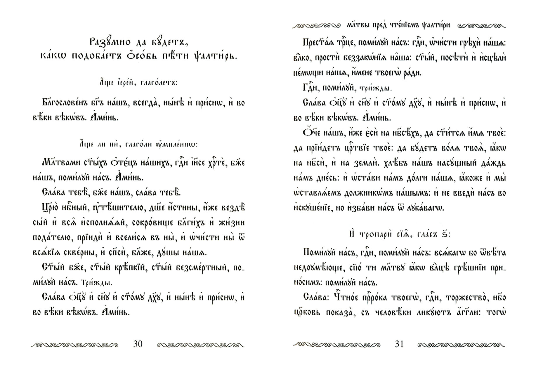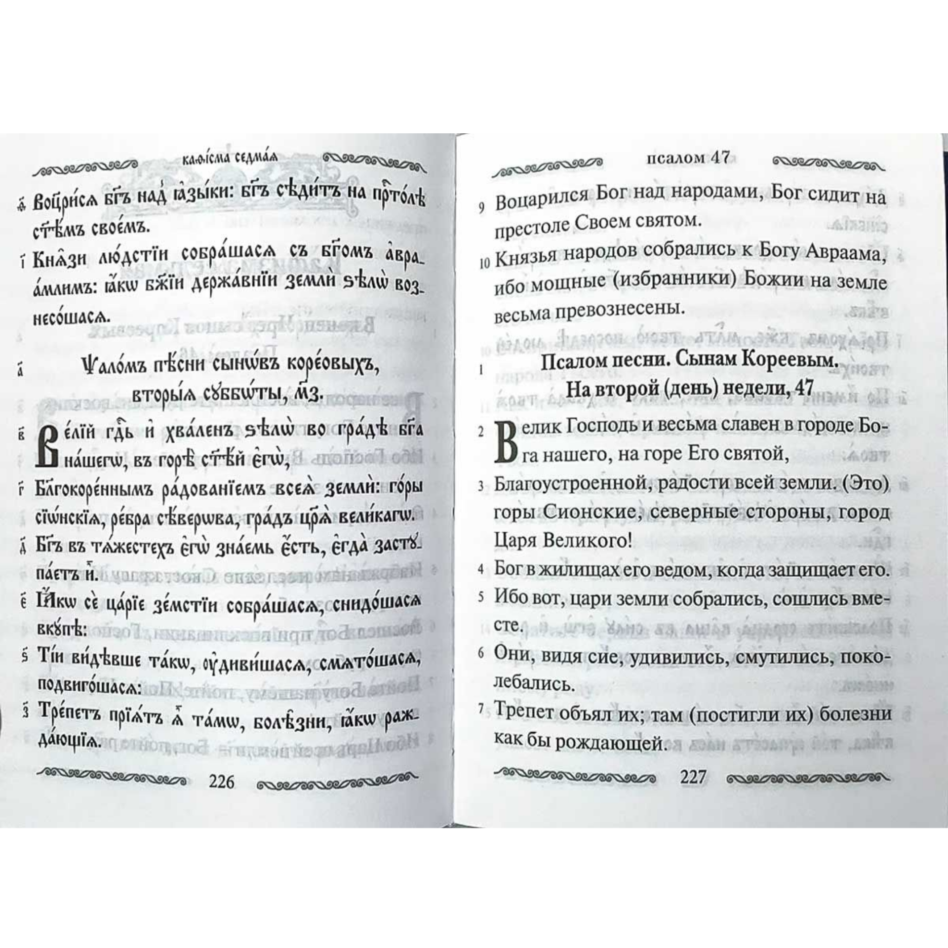 Псалтирь набрана средним шрифтом, а вот молитвы мелким. Есть краткая информация о происхождении Псалтири, о псалмах, немного о церковно-славянском языке, как читать по уставу церкви и житие св. царя и пророка Давида. Перевод очень некачественный (здесь делаю заметки относительного своего переводческого опыта, так как сама являюсь переводчиком). Многие церковно-славянские слова не переведены, из-за чего полностью понятным псалом для незнающих не становится. Толкования помещены в самый конец книги, что также отдаляет понимание, к тому же настолько кратко и не указаны источники толкования. В самом конце книги находится краткая информация по церковно-славянскому языку.