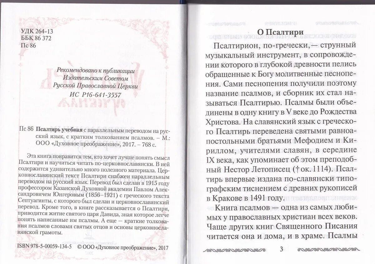 Эта книга понравится тем, кто хочет лучше понять смысл Псалтири и научиться читать по-церковнославянски. В ней содержится удивительно много полезного материала. Церковнославянский текст Псалтири снабжен параллельным переводом на русский язык. Перевод был сделан в 1915 году профессором Казанской Духовной академии Павлом Александровичем Юнгеровым (1856-1921) с греческого текста Септуагинты, с которого был сделан и церковнославянский перевод. Кроме того, в книге рассказывается о Псалтири, приводится житие святого царя Давида, зная которое легче понять написанные им псалмы. А еще - краткие толкования псалмов словами святых отцов и основы церковнославянской грамоты.