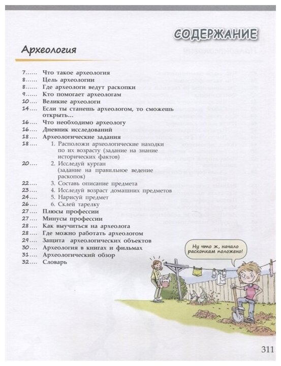 Очень интересная и познавательная книга, много нового можно узнать даже взрослым. В содержании всего 9 профессий: археология, палеонтология, ботаника, астрономия, метеорология, архитектура, театр, кино, психология. По каждой тема раскрывается очень подробно, множество фактов, интересных заданий и т.д. Очень хотелось бы подобную книгу, в которой по такому же типу раскрывались ещё другие профессии.