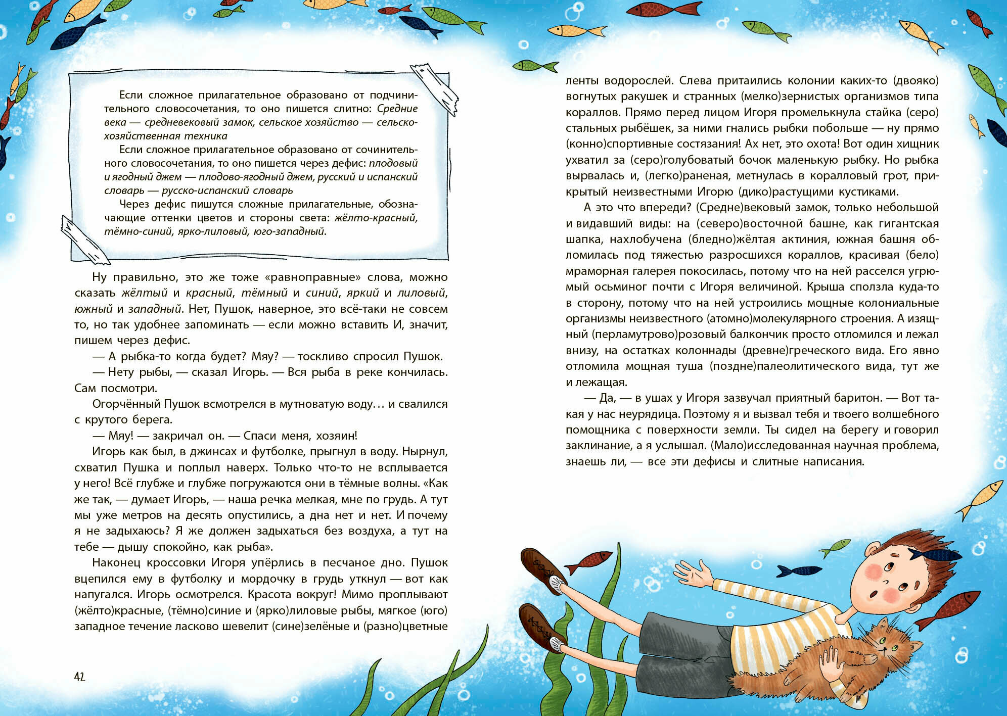 Замечательная книга для школьников — причем и для тех, кто увлекается русским языком, и для тех, у кого с этим предметом проблемы. Первые найдут много интересного, о чем не рассказывают в школе: тут есть вставки с историей языка, рассказы о старых буквах, о появлении дефиса (мне самой было интересно!). А для тех, кто считает предмет скучным, не может запоминать правила, книга должна сделать самое главное — заинтересовать. И для этого, мне показалось, в ней тоже всё есть: веселые приключения (про современных детей, что немаловажно!), классные иллюстрации, слова-запоминалки прямо на рисунках.
