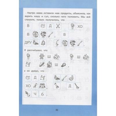 Из удачного в книге - в самом начале есть расшифровка всех картинок, т.е. если ребёнок самостоятельно не сможет догадаться какой слог или буква зашифрованы - всегда можно посмотреть.