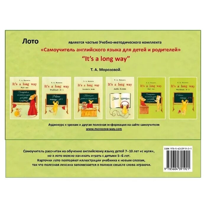 Лото является частью учебно-методического комплекта "Самоучитель английского языка для детей и родителей" "It's а long way" Т. А. Морозовой. Самоучитель рассчитан на обучение английскому языку детей 7-10 лет "с нуля", но в лото можно начинать играть с детьми 5-6 лет. Карточки лото повторяют иллюстрации учебника к новым словам, так что полезная лексика запоминается в полном смысле слова играючи.