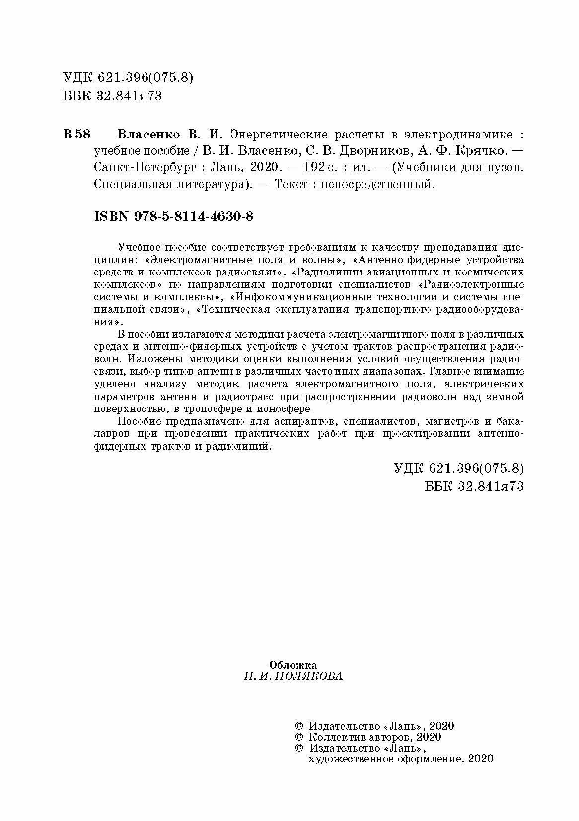 Энергетические расчеты в электродинамике. Учебное пособие (Власенко Виктор Иванович, Дворников Сергей Викторович, Крячко Александр Федотович); Лань, 2020
