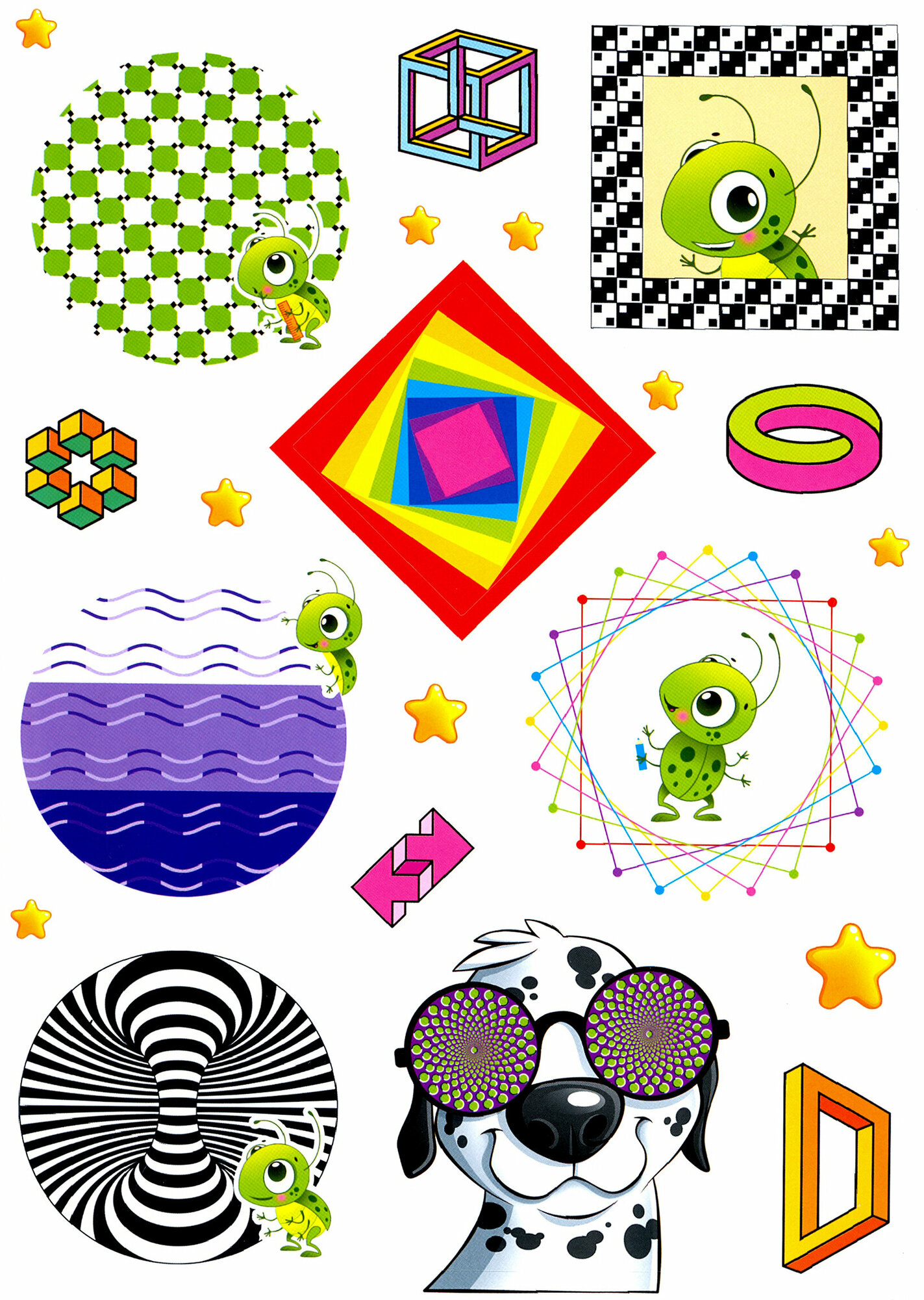 Двигающиеся картинки, перевёртыши, объёмные изображения, невозможные фигуры, фокусы с цветом - всё это появится в книжке, если выполнить все задания, наклеить наклейки, дорисовать и раскрасить картинки.