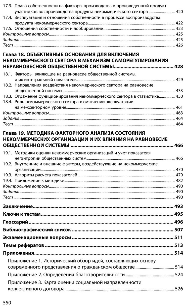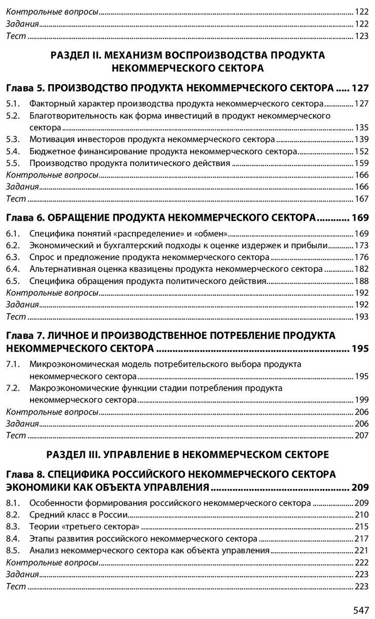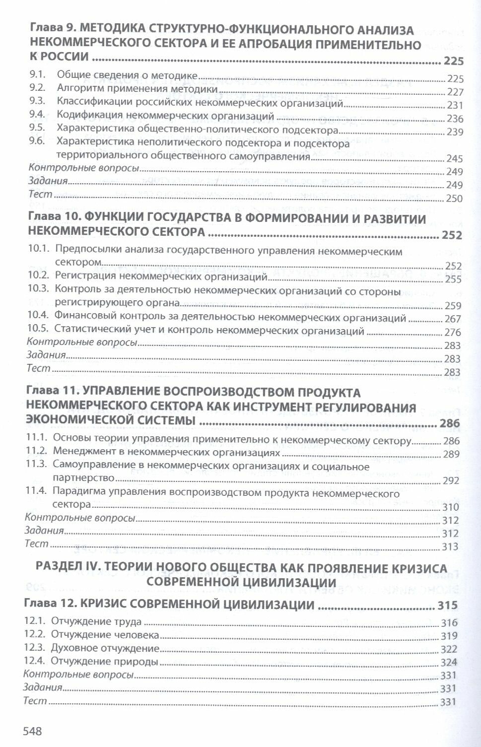 Учебник состоит из пяти разделов: "Предмет и методология экономики некоммерческого сектора", "Механизм воспроизводства продукта некоммерческого сектора", "Управление в некоммерческом секторе", "Теории нового общества как проявление кризиса современной цивилизации", "Некоммерческий сектор как фактор поддержания равновесия общественной системы". Каждая глава, помимо теоретического материала, содержит перечень основных понятий, контрольные вопросы, задания и тест.