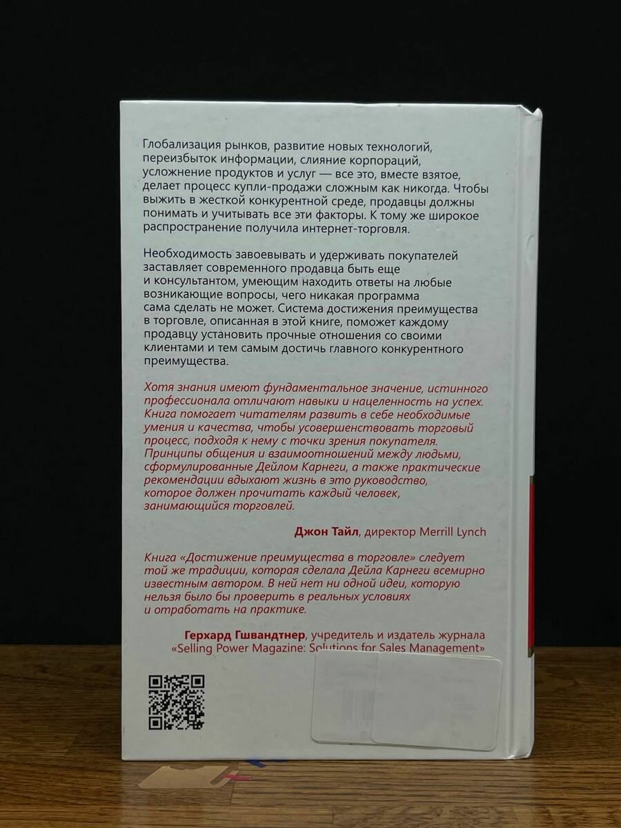 Книга "Достижение преимущества в торговле" следует той же традиции, которая сделала Дейла Карнеги всемирно известным автором. В ней нет ни одной идеи, которую нельзя было бы проверить в реальных условиях и отработать на практике. - Герхард Гшвандтнер, учредитель и издатель журнала "Selling Power Magazine: Solutions for Sales Management"