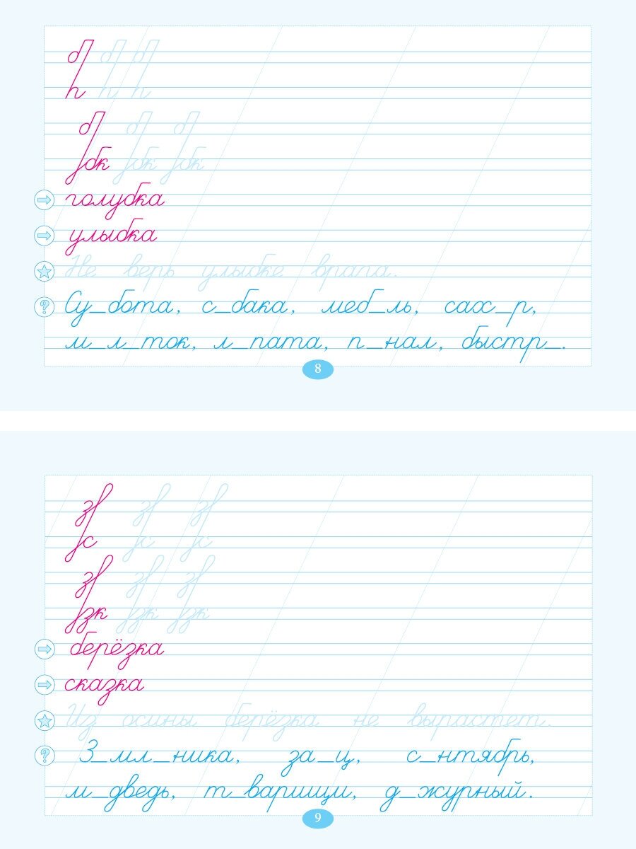 Основу чистописания составляют росчерки (с них начинается каждая страничка). Они направлены на отработку соединений букв, которые дальше лежат в основе словарного слова (слов). Работа со словарным словом ведётся согласно методике преподавания русского языка в начальных классах (тема урока). Внизу страницы дана пословица, в которую включено изучаемое слово. Бледный цвет необходимо обвести (росчерки и пословицы).