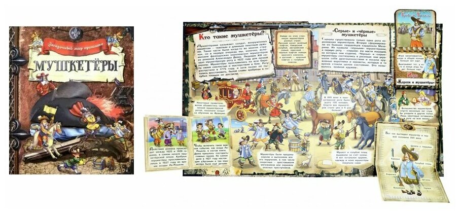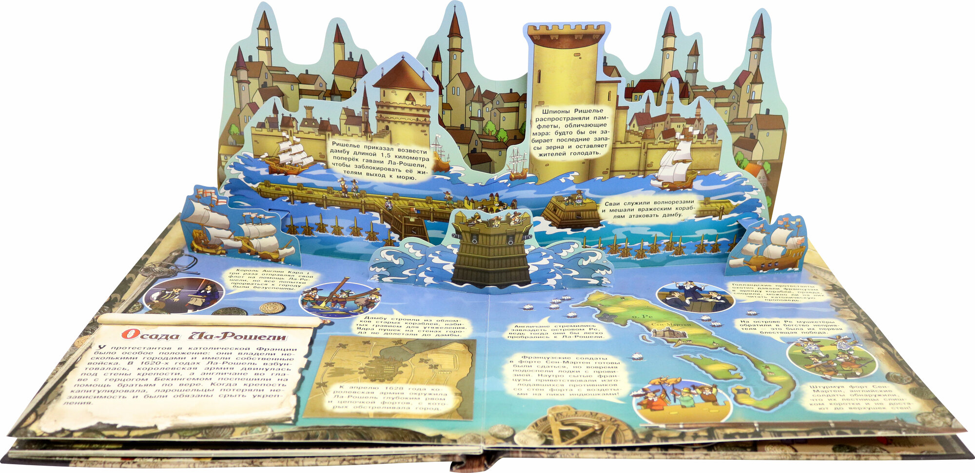 Как и в остальных книгах серии, здесь множество открывающихся клапанов и подвижных конструкций, карточная игра "Короли и мушкетёры", объёмная сцена осады и прочие интерактивные элементы - всё, чтобы заинтересовать ребёнка книгой-игрой и загадочным миром прошлого.