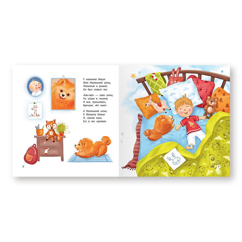 "Маленький шпиц" - это весёлая история о том, как щенок помогает малышу справиться с разными задачками в течение дня.