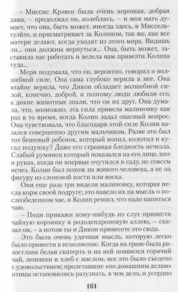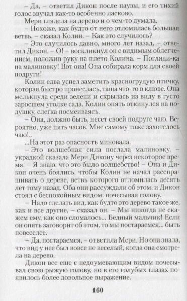 Простая, мудрая, поучительная история одинокой, никем не любимой девочки-сироты, жизнь которой удивительным образом меняется после того, как она попадает в заброшенный таинственный сад, который открывает свои секреты лишь тем, кто наделен щедрым и открытым сердцем, способным откликнуться на чужую боль и стать кому-то настоящим другом. "Одна из самых великих книг, когда-либо написанных для детей" (Дж. Мейссон).