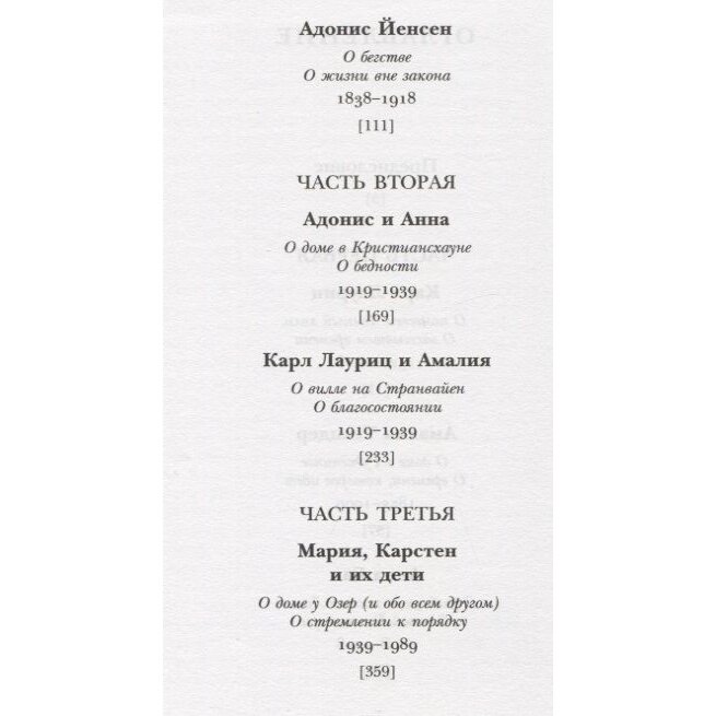 В этом романе автор рассказывает историю одной датской семьи начиная с 16 века. Пять поколений, неслучайные закономерности и случайные неожиданности, когда любое событие, действие или встреча влияют на течение жизни, на судьбы людей. Через призму наблюдений за меняющими друг друга поколениями семьи, читатели наблюдают перемены, происходящие в Дании: как трансформируются взгляды, традиции, мода, воспитание, стремления и ориентиры. Шаг за шагом, десятилетие за десятилетием, столетие за столетием. Люди из разных социальных слоёв, с разным воспитанием и материальным достатком, у которых на первый взгляд нет ничего общего, находят друг друг среди тысяч других, чтобы выполнить свою, одному Богу или другому высшему существу во Вселенной существу, миссию, в данном случае - продолжить род. Тут не «жили они долго и счастливо, и умерли в один день», а тяжёлые испытания, лишения и невзгоды, протесты, как внешние, так и внутренние, в стремлении найти себя и свой путь.