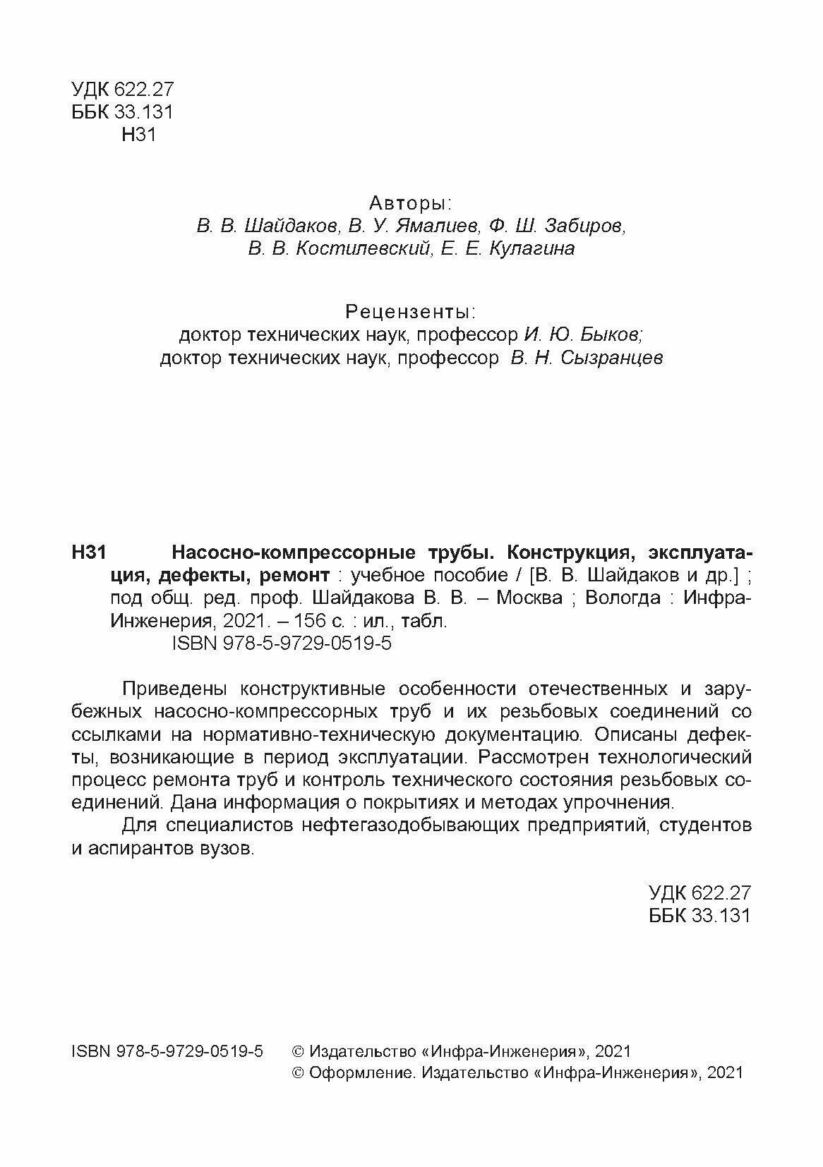 Насосно-компрессорные трубы. Конструкция эксплуатация дефекты ремонт. Учебное пособие (Костилевский В. В., Забиров Ф. Ш., Ямалиев Виль Узбекович, Шайдаков Владимир Владимирович, Кулагина Е. Е.); Инфра-Инженерия, 2020