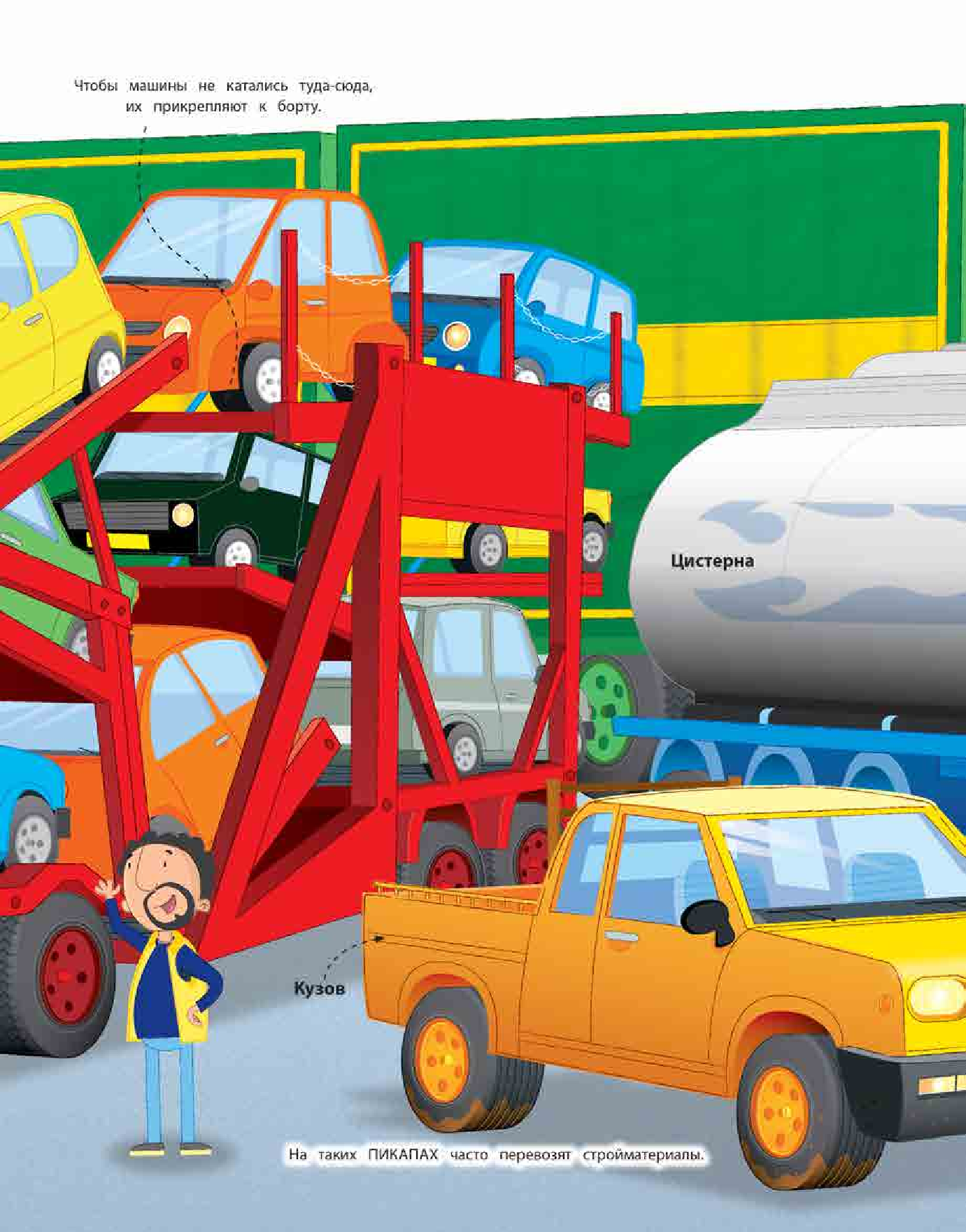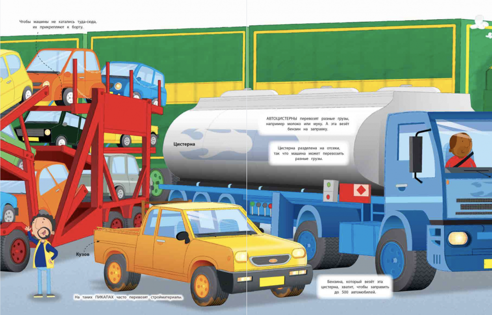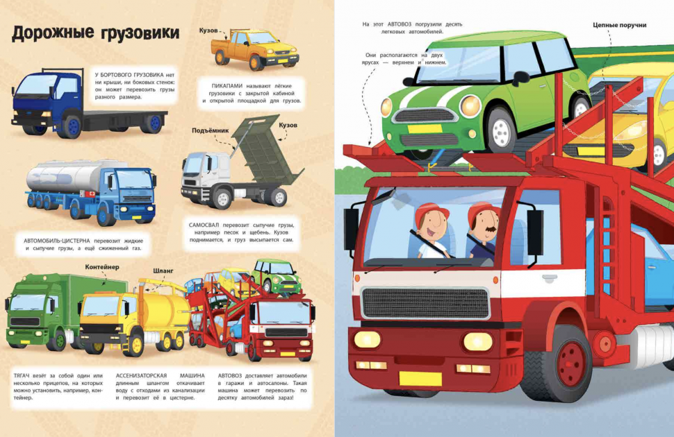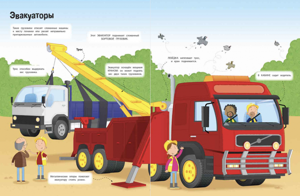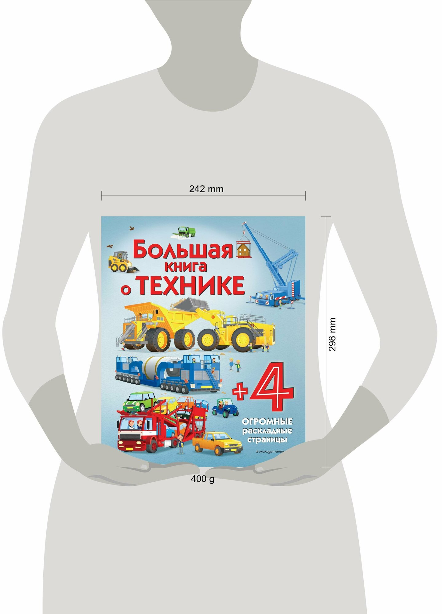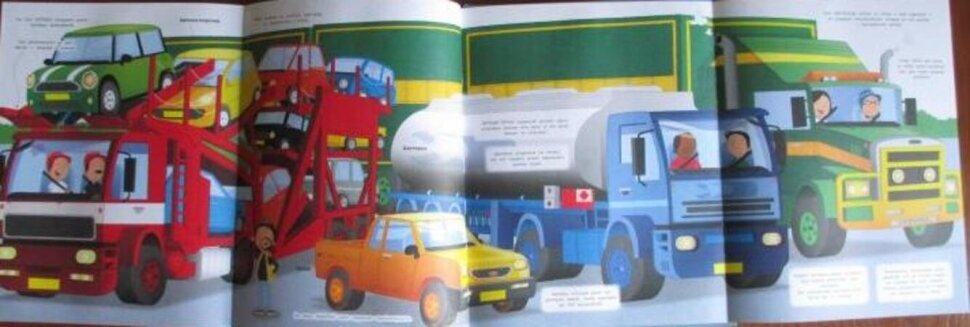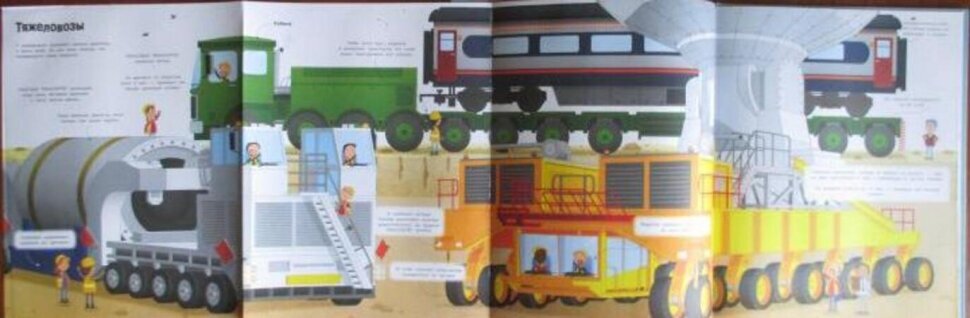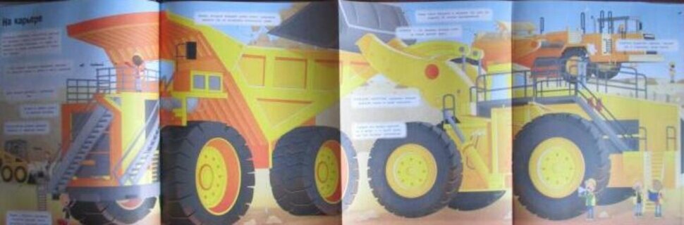 Книга большая. Картинки яркие, красочные, большие. Страницы разворачиваются, показывая технику в большем масштабе. Хорошо прорисованы детали самой техники. Текста немного, но он познавательный. В текстом описываются детали самой машины. Позволяет изучать с ребенком различную технику. Обложка из плотного картона. Страницы плотные, приятные на ощупь. Ребенок остался в восторге от книги.