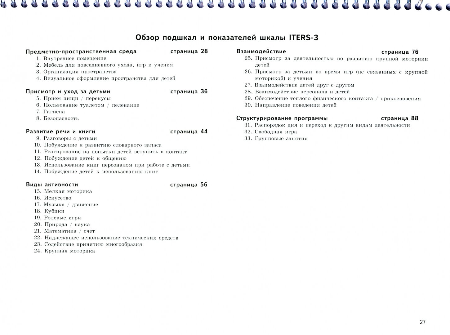 В ITERS-3 используются шесть подшкал: 1) предметно-пространственная среда; 2) присмотр и уход за детьми; 3) развитие речи и книги; 4) виды активности; 5) взаимодействие; 6) структурирование программы. Каждая из них предусматривает 7-балльное оценивание: 1 (неудовлетворительно), 3 (минимально), 5 (хорошо) и 7 (отлично). Для повышения точности оценивания каждого из качественных показателей в книгу добавлены пояснения и примеры. Помимо полных инструкций по применению и оценке, к шкалам также прилагаются оценочный лист и профиль качества, которые можно отксерокопировать.