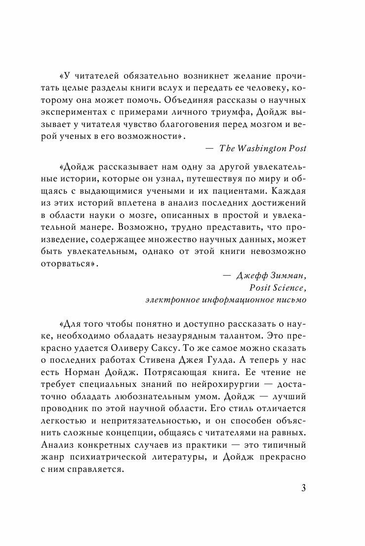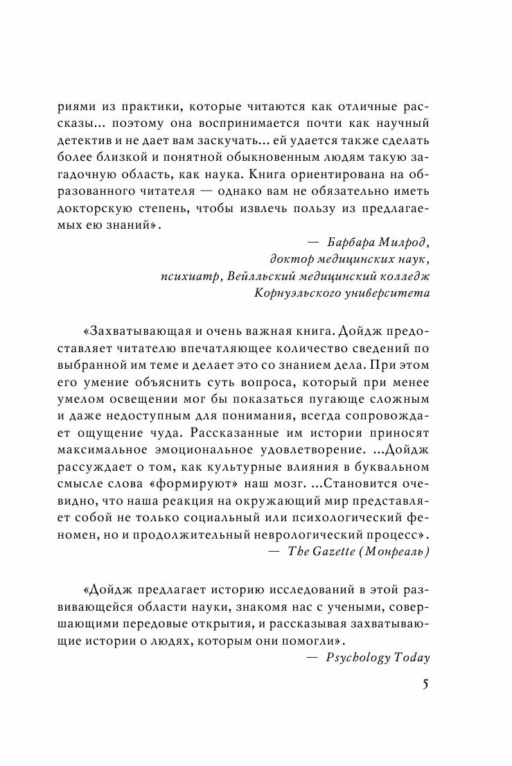Норман Дойдж предлагает революционный взгляд на человеческий мозг. Он рассказывает о блестящих ученых, продвигающих пока еще новую науку о нейропластичности, и о поразительных успехах людей, жизнь которых они изменили, - примеры выздоровления пациентов, перенесших инсульт; случай женщины, имевшей от рождения половину мозга, который перепрограммировал сам себя для выполнения функций отсутствующей половины, истории преодоления необучаемости и эмоциональных нарушений, повышения уровня интеллекта и восстановления стареющего мозга. Методики, представленные в книге, будут интересны и полезны всем читателям.