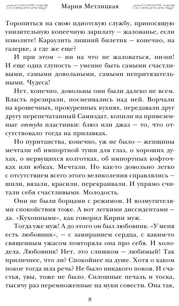 Кира приехала в родной город, где прошли самые счастливые и самые несчастные ее годы. Счастливые — потому что здесь она встретила своего Мишку. Несчастные — потому что из этого города им пришлось бежать — от неустроенности, нищеты, унизительной невозможности жить так, как хочется. Москва стала совсем другой, да и Кирина жизнь изменилась. Главное — она потеряла Мишку. И теперь ей казалось, что жизнь остановилась, что счастья не будет никогда. Нет человека, ради которого стоит просыпаться по утрам. Но жизнь не прощает уныния. Она как будто говорит: оглянись. Наверняка есть тот, кто в тебе нуждается. И в этом городе, полном воспоминаний, Кира снова нашла свое счастье. Потому что к хорошим людям оно всегда приходит. Иначе и быть не может.