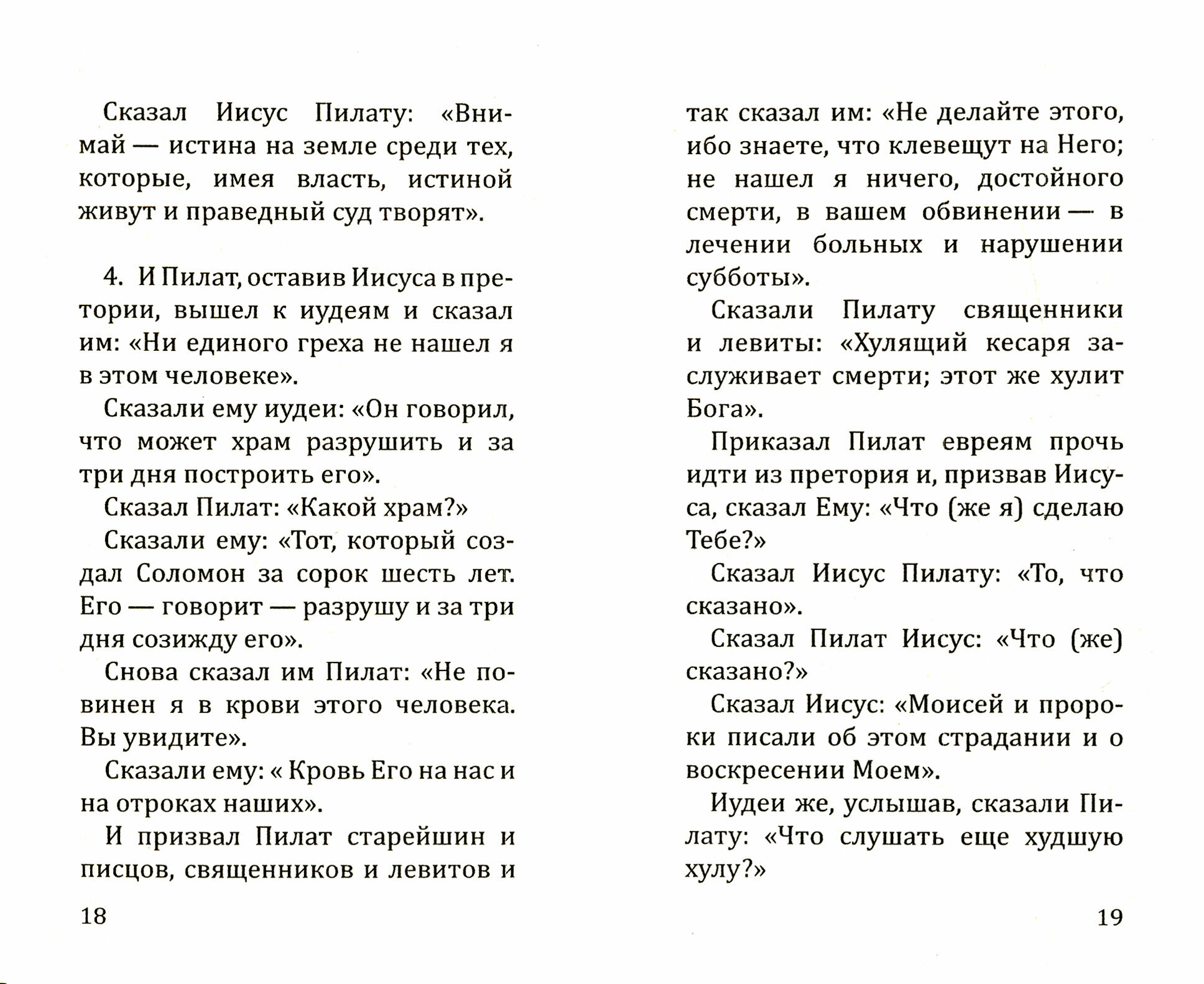 Очень интересный источник. Рассказ в нем ведется от нескольких лиц, что делает Евангелие удивительным. Прочитав его лучше понимаешь иконографию сюжета Сошествия во ад. Интересно передается историческая атмосфера событий 2000-летней давности. Веришь каждому слову священного предания. Крупный шрифт позволяет удобно читать даже детям. Рекомендую к прочтению каждому кто интересуется христианской культурой.