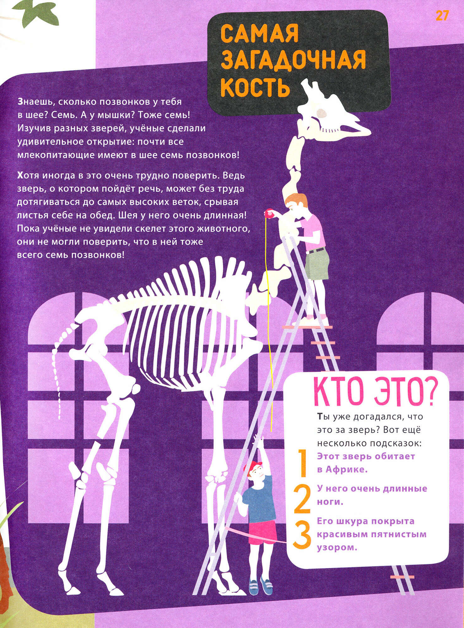 На страницах книги юные читатели (и их родители) познакомятся с удивительными животными - обладателями самых лёгких, тяжелых или необычных костей. Книга представляет собой "угадайку" с подсказками. Читатели изучают скелеты животных, угадывают, кому они принадлежат, а ответ находят на следующей странице. Статьи краткие, но содержательные, написаны легко и увлекательно, а великолепные красочные иллюстрации служат отличным дополнением к содержанию. Всё это, несомненно, пригодится в школьной жизни.