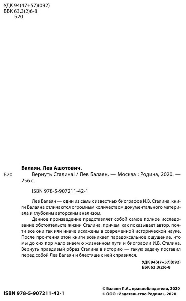 Книга: Вернуть Сталина! (Лев Балаян); Родина, Редакция 1, 2020