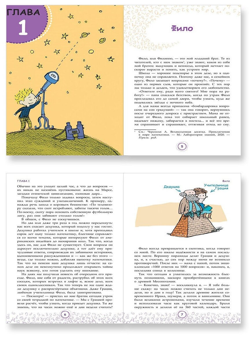 Главные действующие лица — любопытный мальчуган Фило и его дедушка, готовый ответить на вопросы своего внука во время самых обычных дел — похода в магазин, приготовлении пиццы или игры в «Морской бой». Почему так сложно выиграть в лотерею? С какой скоростью размножаются вредные микробы? Как зашифровать свои самые секретные сообщения? И ещё много-много вопросов «Как?» и «Почему?». . .