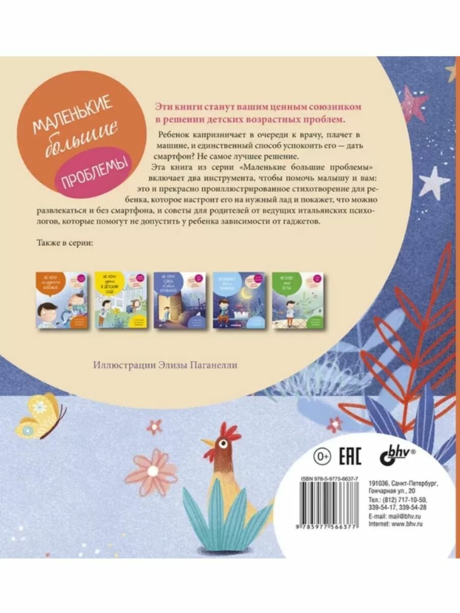 Книга из серии «Маленькие большие проблемы» включает два инструмента, чтобы помочь малышу и вам: это и прекрасно проиллюстрированное стихотворение для ребенка, которое настроит его на нужный лад и покажет, что можно развлекаться и без смартфона, и советы для родителей от ведущих итальянских психологов, которые помогут не допустить у ребенка зависимости от гаджетов.