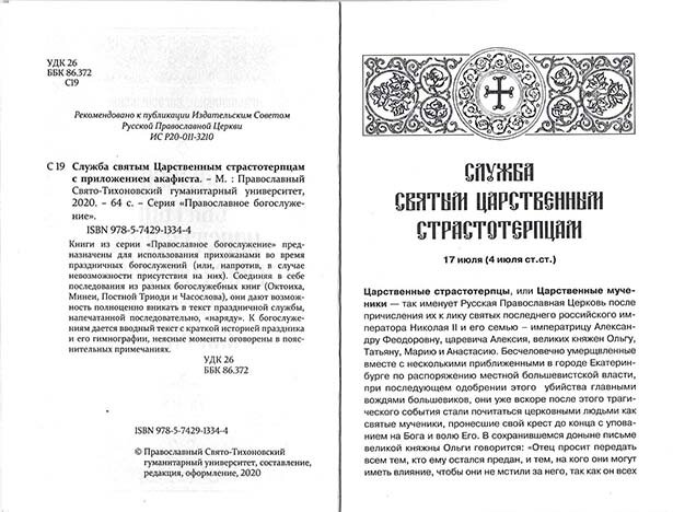 Служба святым Царственным страстотерпцам с приложением акафиста; Православный Свято-Тихоновский гуманитарный университет, 2020