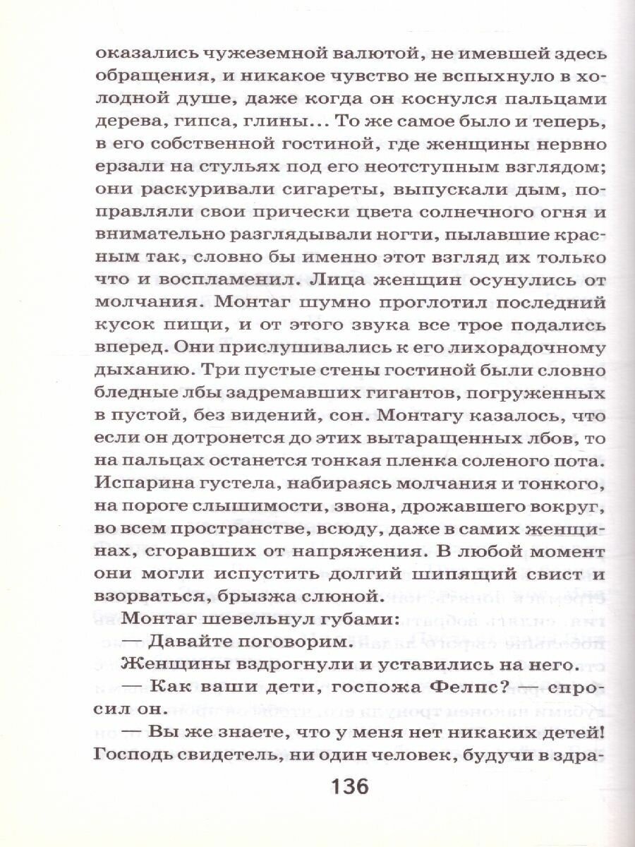 Философская антиутопия Брэдбери рисует беспросветную картину развития постиндустриального общества. Роман, принесший своему творцу мировую известность. "451 по Фаренгейту" Рэя Брэдбери изучают на уроках литературы в 10-11 классах. Для среднего и старшего школьного возраста. «Я написал всего одну научно-фантастическую книгу, и это "451° градус по Фаренгейту"». - Рэй Брэдбери Роман-пророчество, роман-предупреждение, роман о мире, в котором все письменные издания безжалостно уничтожаются специальным отрядом пожарных, телевидение успешно служит всеобщему оболваниванию, карательная психиатрия решительно разбирается с редкими инакомыслящими, а на охоту за неисправимыми диссидентами выходит электрический пёс…