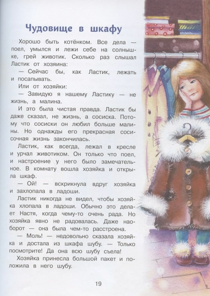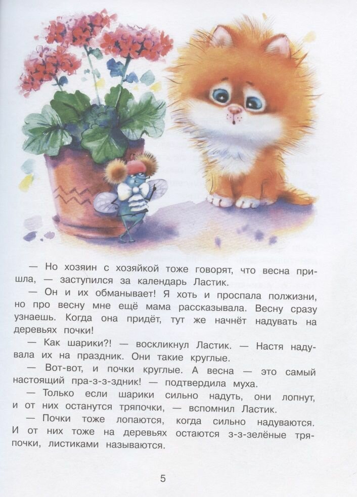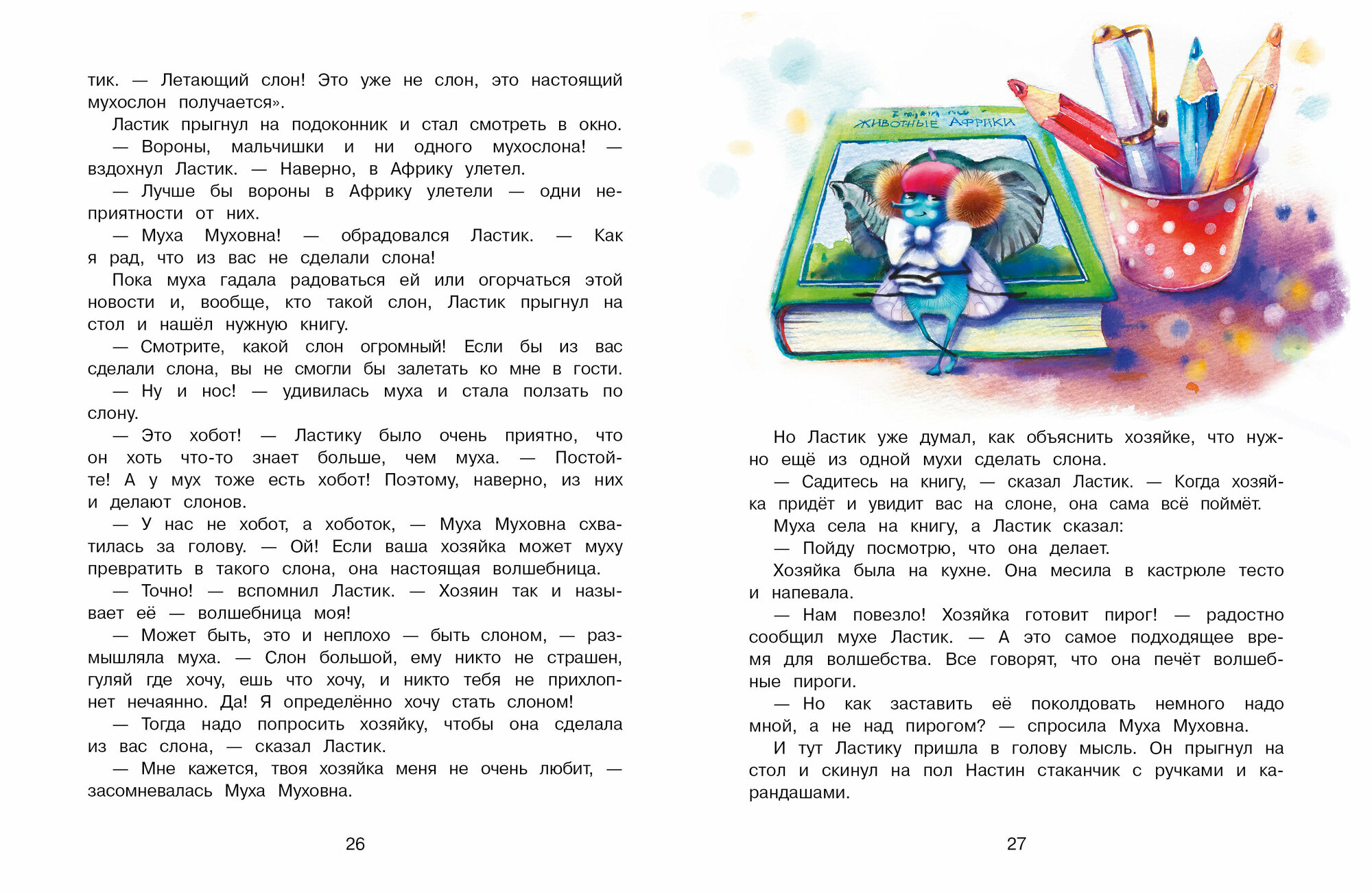 Как хорошо быть котенком! У тебя есть девочка Настя, которая любит тебя и всегда рада поиграть, и друг в зеркале, и сосиска в миске... Но однажды в жизни котенка Ластика появляется Муха Муховна. Она знает обо всем на свете и даже умеет ходить по потолку! С ней так интересно отращивать полоски, делать из мухи слона, сражаться с пылесосом и спасаться от опасного дождя. Милые, чудесные образы для персонажей книги придумала художница Евгения Соловьева.